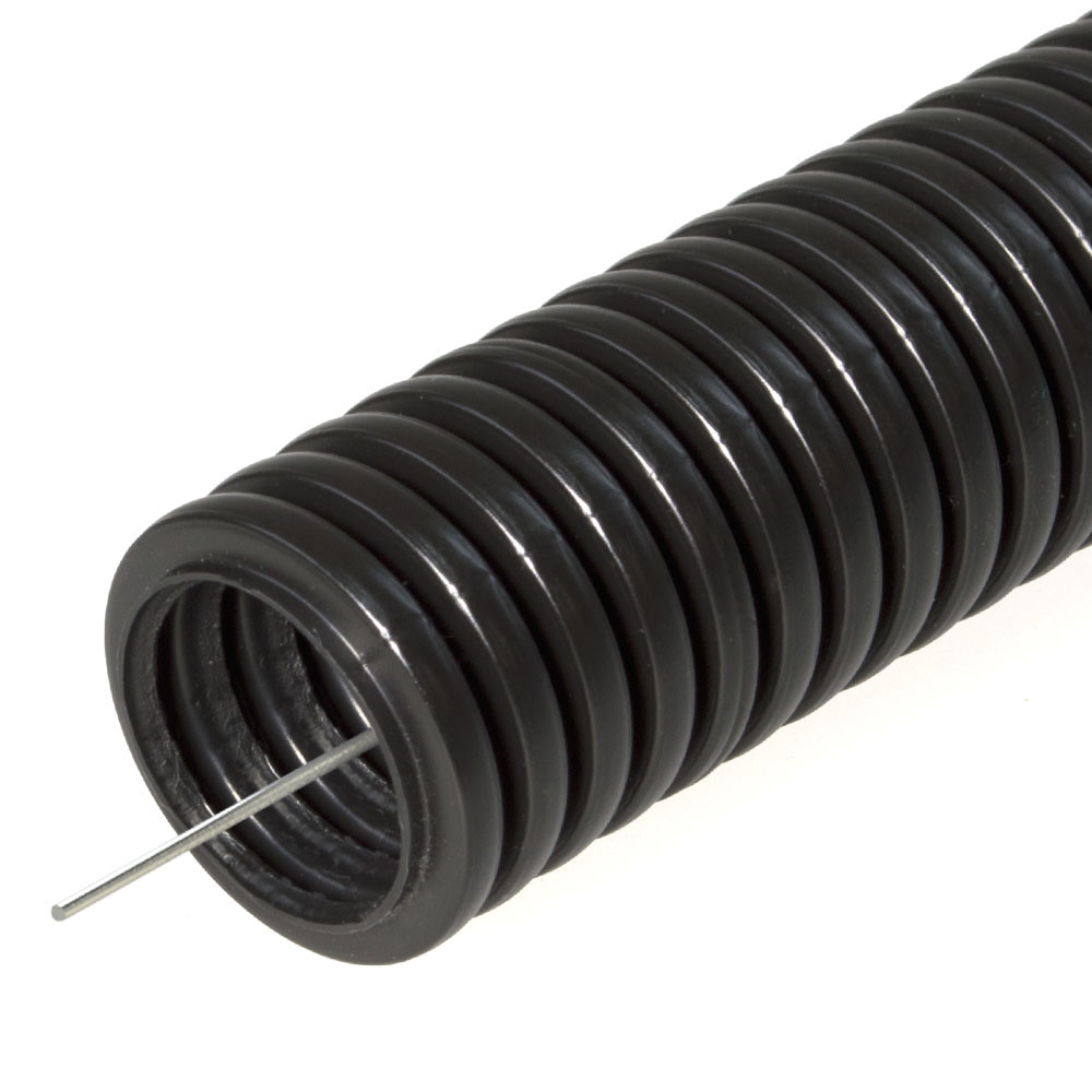 Труба гофрированная ПНД лёгкая 350 Н безгалогенная (HF) стойкая к ультрафиолету черная с протяжкой d25 мм (50 м/2600 м уп/пал) Промрукав