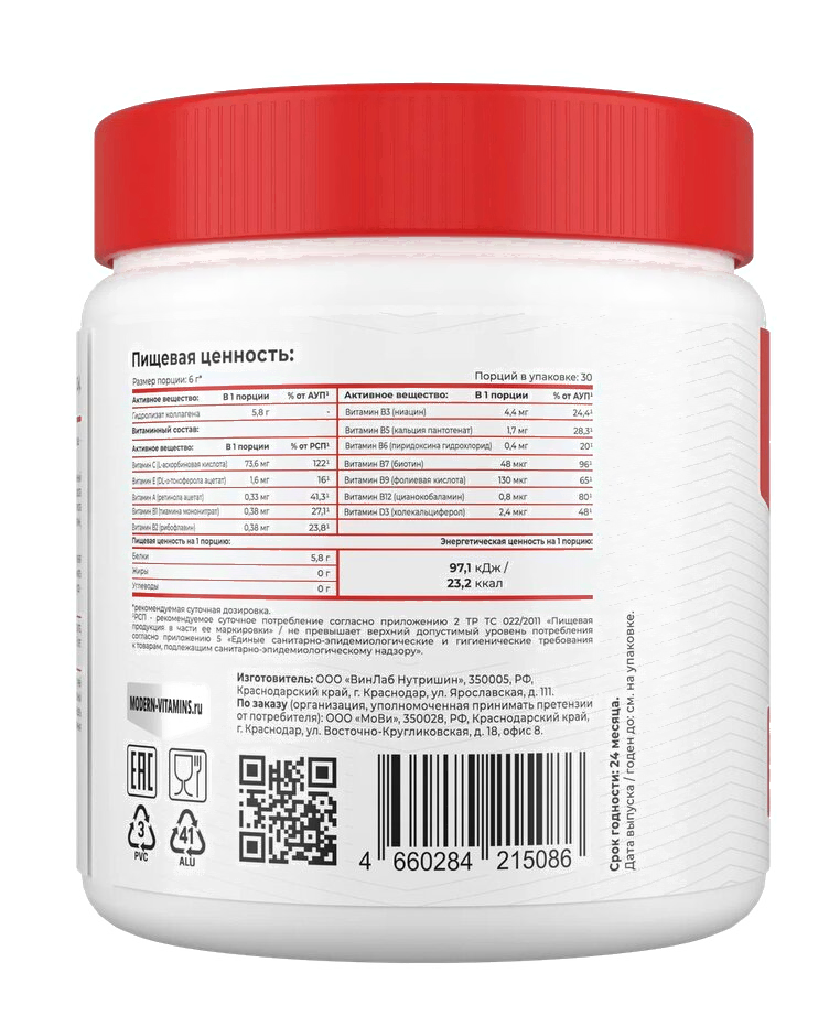 • Витамины C, E, A, B1, B2, B3, B5, B6, B7, B9, B12, D3