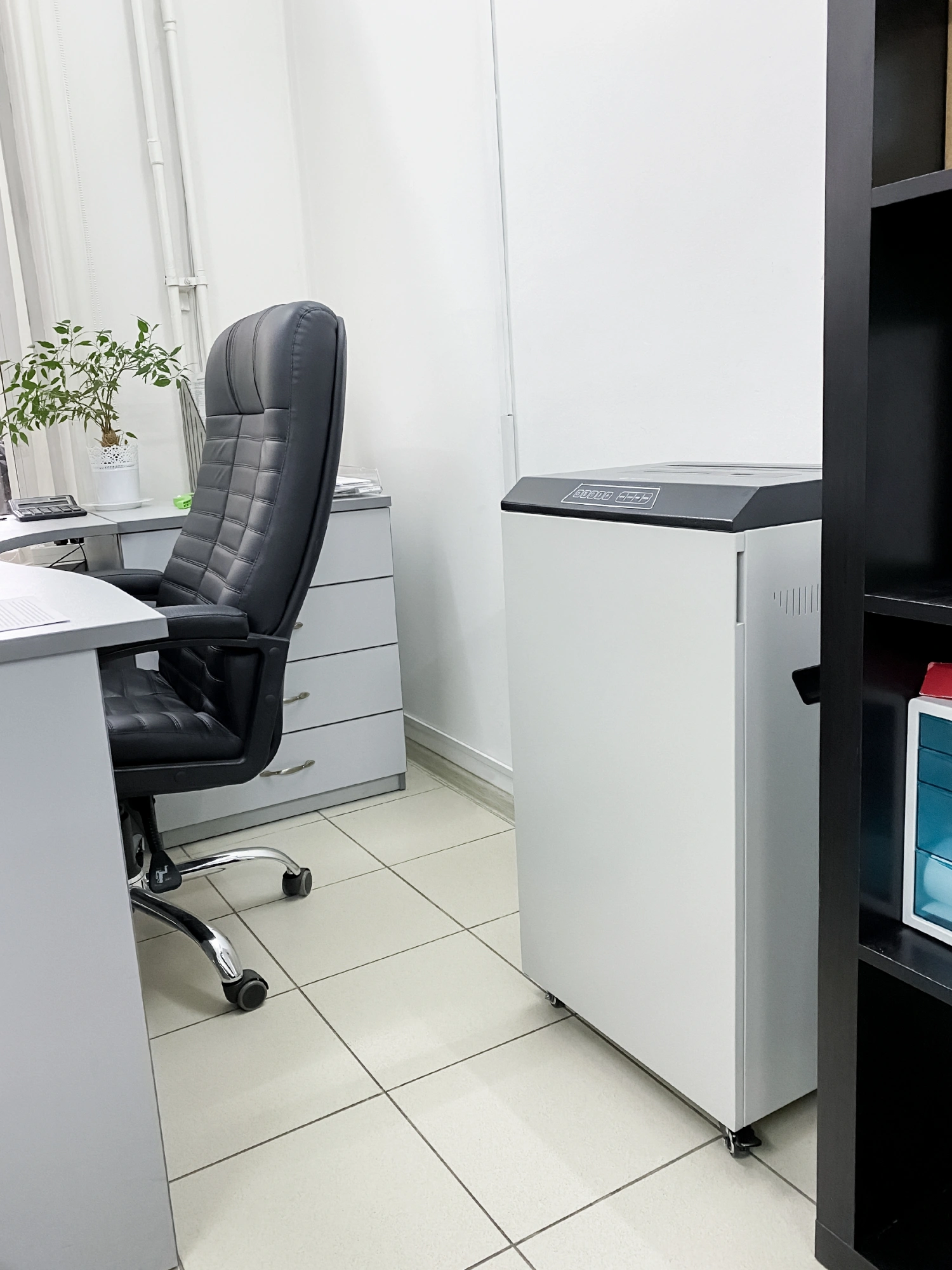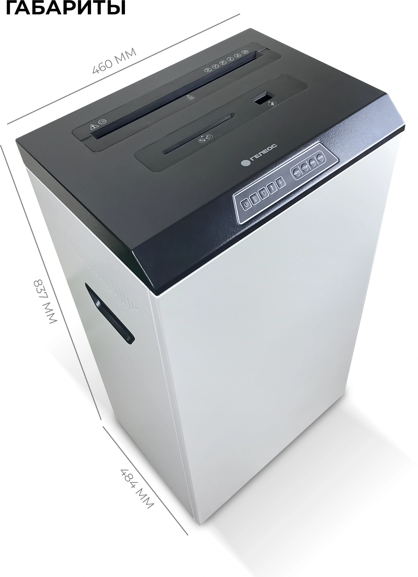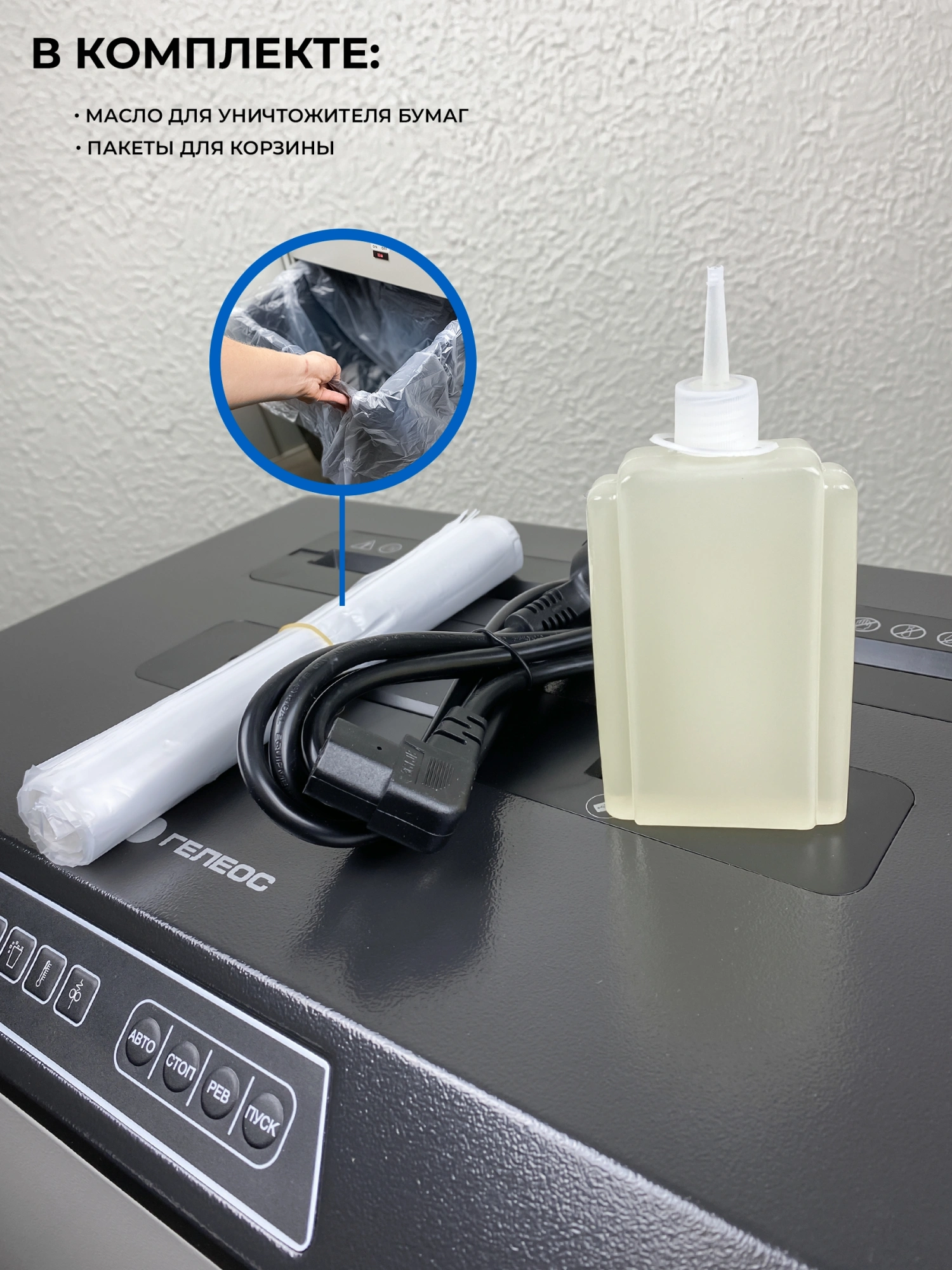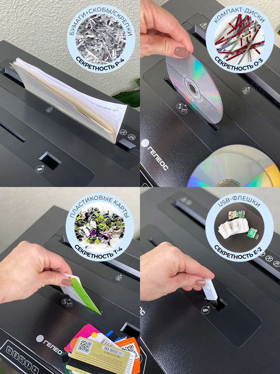 Шредер Heleos УО65-5 белый (секр.P-5) фрагменты 20лист. 65лтр. скрепки скобы пл.карты CD