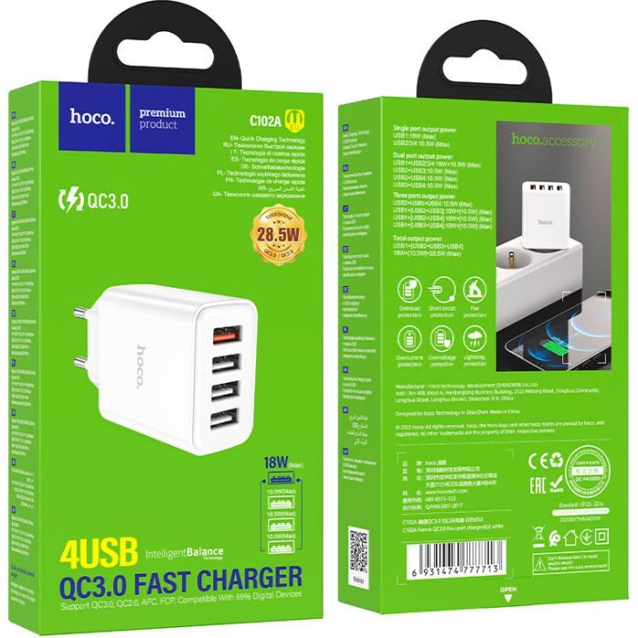 - Модель C102A Fuerza 1xUSB QC3.0 + 3-port USB 18W White