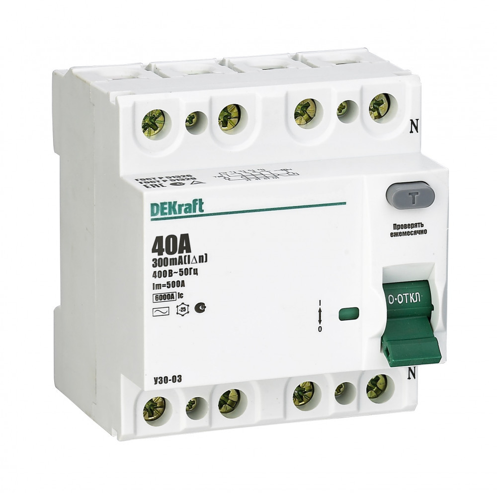 Выключатель дифференциального тока серии УЗО-03 DEKraft; 4P; номинальный ток 40; ном.дифф. ток 300 мА; электромеханический; тип дифференциального расцепителя - AC; ширина – 4 мод. х 18 мм; монтаж – на DIN-рейку. ВДТ устанавливаются в сетях напряжением до 400 В пер.тока. ВДТ применяются для защиты электроустановок от риска возникновения пожаров вследствие утечек тока. Конструкция устройств позволяет эксплуатировать их даже при низкой температуре.