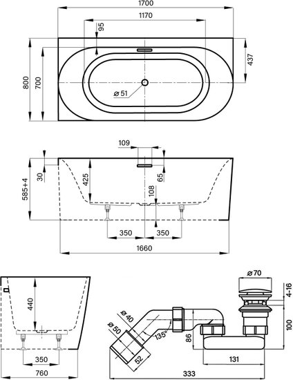 Collaro 170x80 28910301R (пристенная ванна (левая) белый глянец, экран, ножки, сифон-автомат хром)