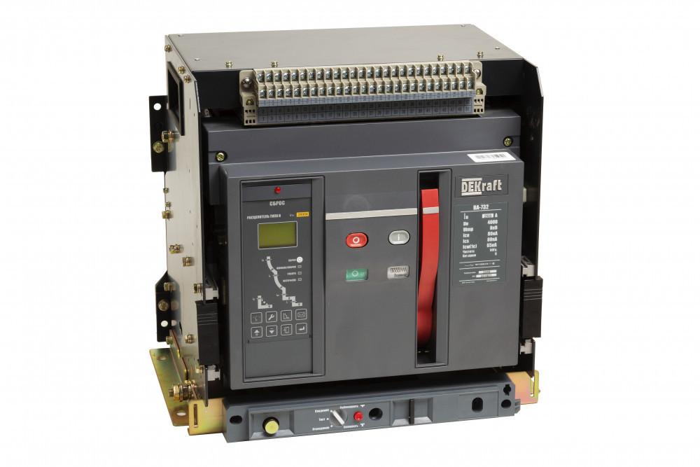 Воздушныйвтоматический выключатель серии ВА-732 DEKraft; 3P; номинальный ток 2000; отключающая способность 80 кА, выкатной, блок управления типа H; присоединения задние горизонтальные. В базовую комплектацию входят моторный привод (230 В пер.тока), 4 контакта состояния ВКЛ/ОТКЛ, сигнальный контакт, электромагнит включения (230 В пер.тока), независимый расцепитель (230 В пер.тока), разделители полюсов и рамка передней панели. Выключатели с блоком управления типа H позволяют осуществлять мониторинг и диспетчеризацию защищаемой сети и нагрузок.