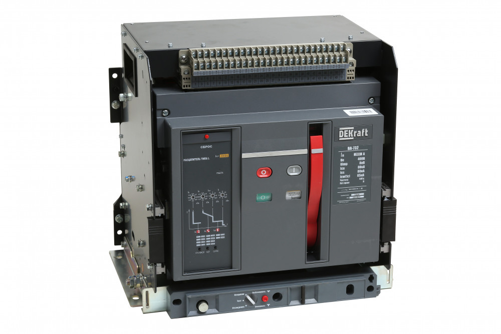 Воздушныйвтоматический выключатель серии ВА-732 DEKraft; 3P; номинальный ток 2000; отключающая способность 80 кА, выкатной, блок управления типа L; присоединения задние горизонтальные. В базовую комплектацию входят моторный привод (230 В пер.тока), 4 контакта состояния ВКЛ/ОТКЛ, сигнальный контакт, электромагнит включения (230 В пер.тока), независимый расцепитель (230 В пер.тока), разделители полюсов и рамка передней панели. Выключатели серии ВА-730 устанавливаются в ГРЩ, ячейки ВРУ в качестве вводных, секционных и распределительныхппаратов.