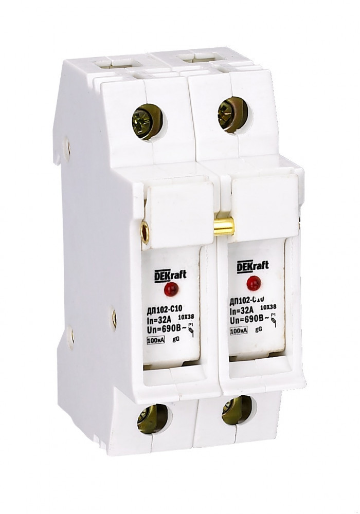 Держатель серии ДП-102 цилиндрического предохранителя ПЦ-102 Dekraft; 2P; для габарита С10 (10 x 38 мм); со светодиодной индикацией срабатывания; номинальный ток – до 32; ширина – 2 мод. х 18 мм; установка – на DIN- рейку; рабочее положение - любое, но предпочтительнее вертикальное; подключение питания - сверху или снизу; степень защиты – IP20. Предохранители применяются для защиты сетей от перегрузки и токов КЗ в сетях напряжением до 500 В.