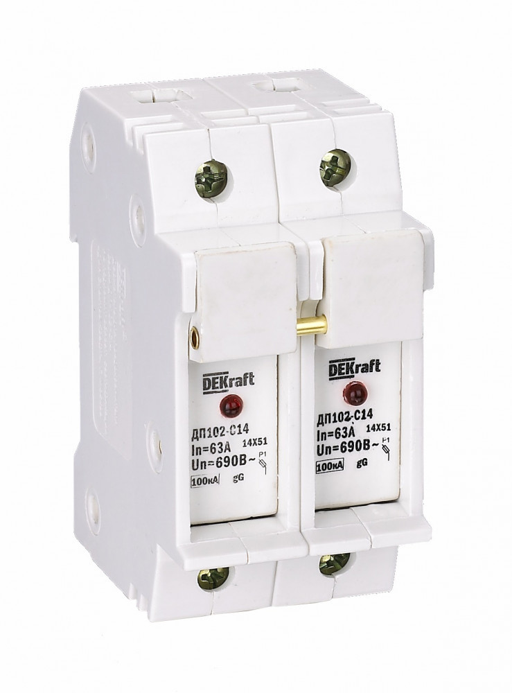 Держатель серии ДП-102 цилиндрического предохранителя ПЦ-102 Dekraft; 2P; для габарита С14 (14 x 51 мм); со светодиодной индикацией срабатывания; номинальный ток – до 64; ширина – 2 мод. х 18 мм; установка – на DIN- рейку; рабочее положение - любое, но предпочтительнее вертикальное; подключение питания - сверху или снизу; степень защиты – IP20. Предохранители применяются для защиты сетей от перегрузки и токов КЗ в сетях напряжением до 500 В.