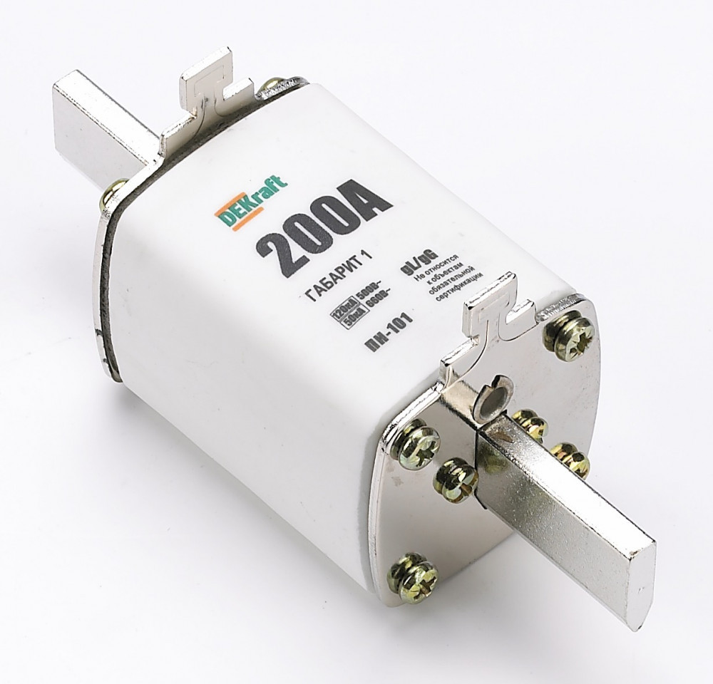 Предохранитель ножевой серии ПН-101 Dekraft; тип 35; габарит 1; ном. ток 200. Предохранители ножевые применяются в однофазных и трехфазных сетях переменного тока, напряжением до 660 В, частотой 50 Гц. Они представляют собой наиболее компактные и экономичные устройства защиты электрических цепей и кабельных линий от перегрузки и короткого замыкания. Индикатор состояния позволяет быть уверенным в защите электрооборудования.