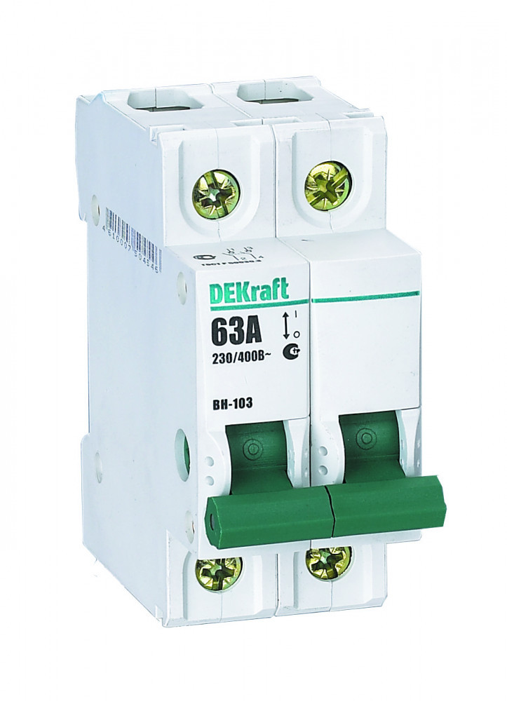 Выключатель-разъединитель серии ВН-103 DEKraft; 2P; номинальный ток 32; ширина – 2 мод. х 18 мм; установка – на DIN-рейку; установочное положение - любое. Выключатели-разъединители применяются для ручного включения/отключения сетей напряжением до 400 В. Специальные мостиковые контакты обеспечивают надежный разрыв цепи; они полностью исключают возможность перекрытия дугой по изоляции. Усиленная рукоятка управления обеспечивает большое количество включений/отключений.