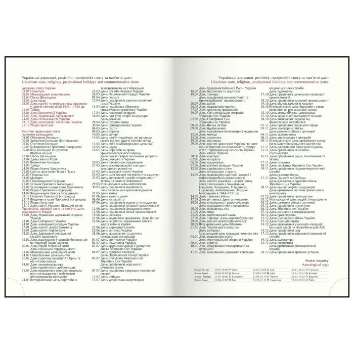 Додатковокоди операторів мобільного зв'язку України , офіційні свята деяких країн світу , українські державні свята , професійні та релігійні свята , одиниці виміру , знаки догляду за одягом , телефонні коди міст , літерні автомобільні коди , таблиця відстаней між обласними центрами України