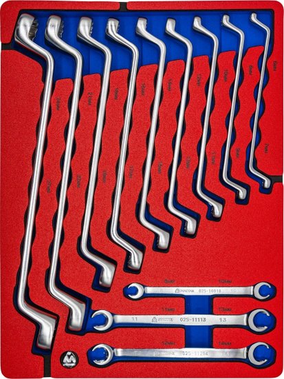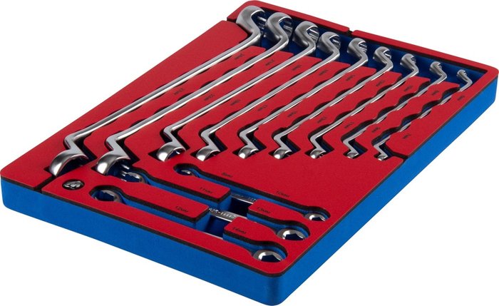 • Комплектация Ключи накидные 75°, разрезные 6×7, 8×9, 10×11, 12×13, 14×15, 16×17, 18×19, 21×22, 24×27 мм; 8×10, 11×13, 12×14 мм; ложемент EVA+PP 380×270 мм