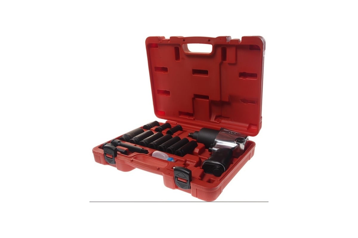 - Комплект поставки Гайковерт ударный пневматический - 1 шт.; Головка средней глубины 1/2"DR. 17, 19, 21 мм - 3 шт.; Головка глубокая с тонкими стенками 1/2"DR. 17, 19, 21 мм - 3 шт.; Головка глубокая ударная 1/2"DR. 22, 24, 27 мм - 3 шт.; Головка для колесных гаек 17мм - 1 шт.; Головка ударная hex 1/2"DR. H12x78L - 1 шт.; Удлинитель ударный 1/2"DR x 5" - 1 шт.; Смазка - 1 шт.; Воздушный штуцер - 1 шт.; Кейс.