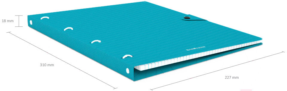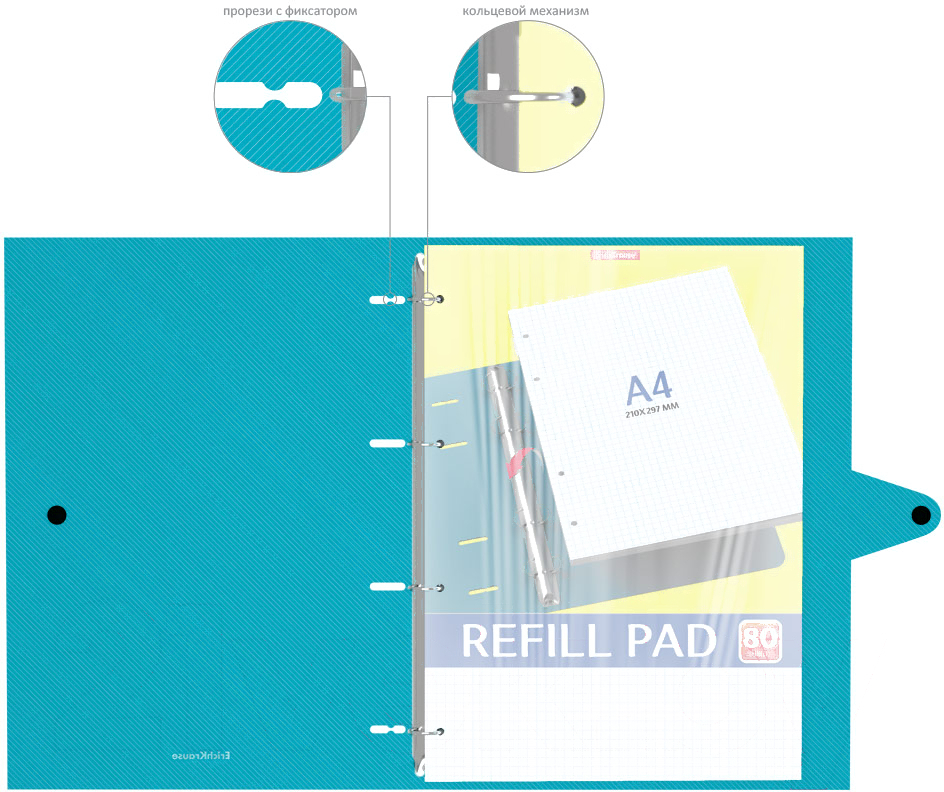 • Особенности закругленные углы, вырубка под кольца, перфорация для подшивки, на кнопке