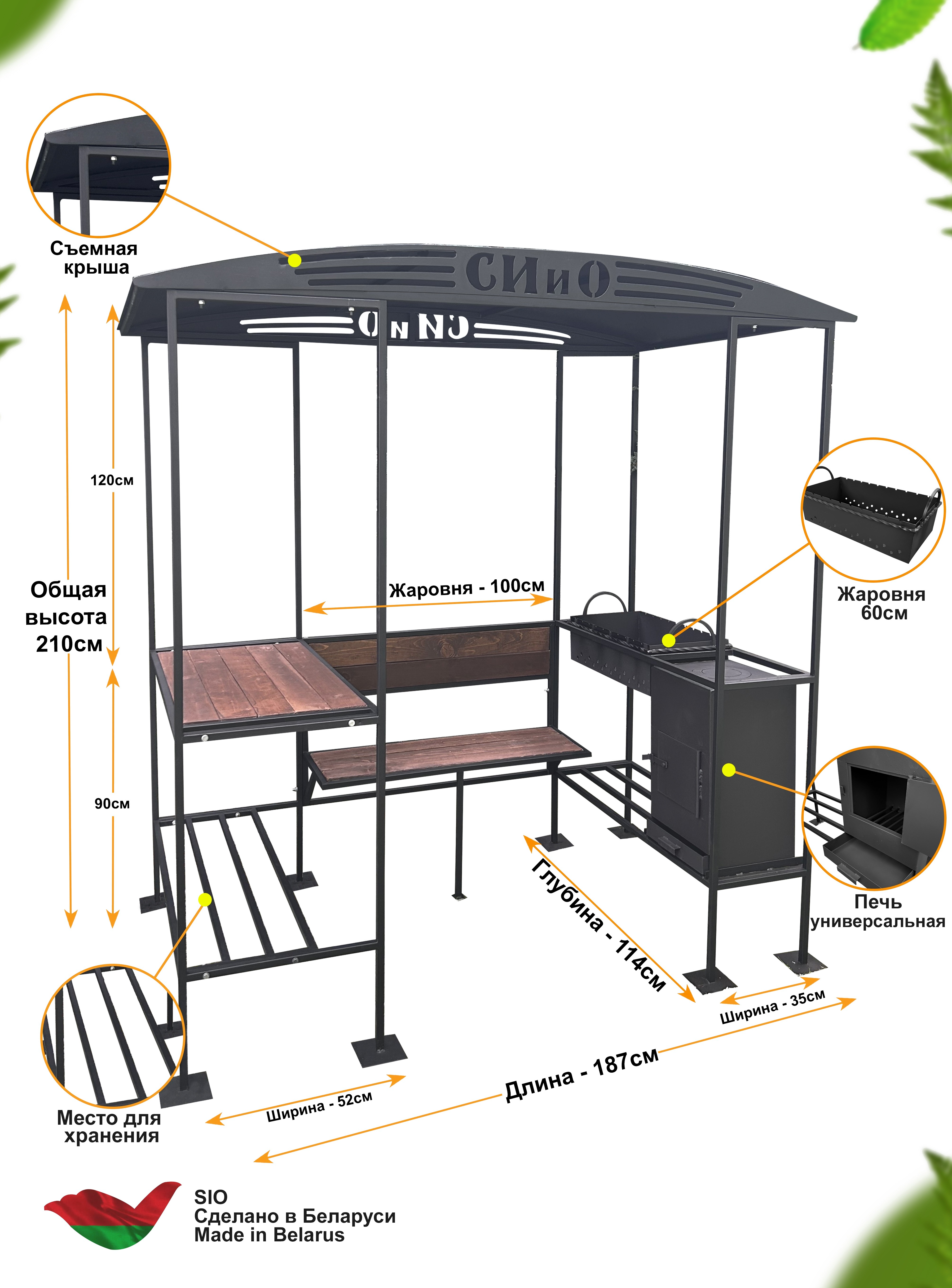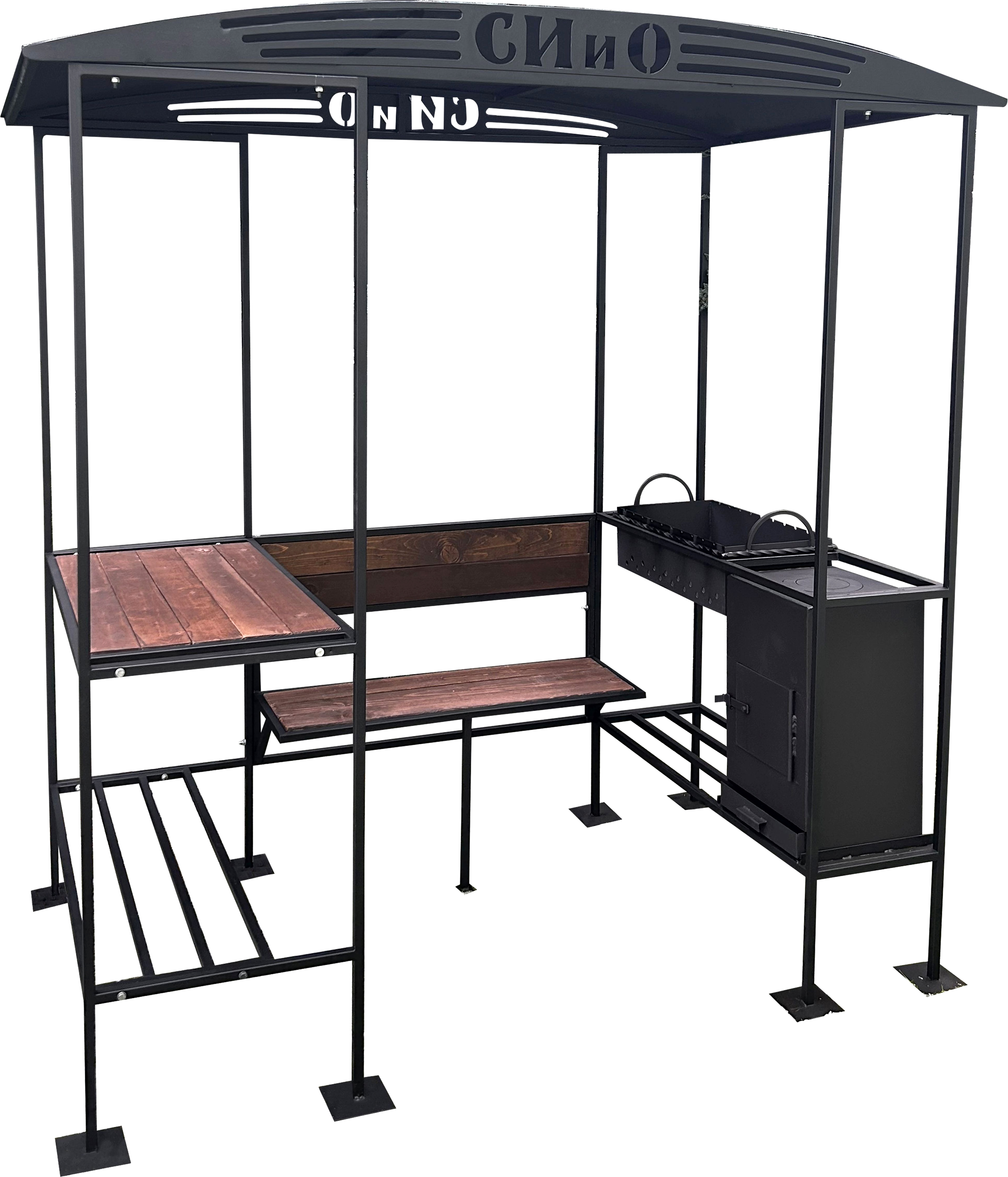 - Оснащение крыша, жаровня (2 мм), печь, дровница (2 шт.), стол, скамейка, дымоход