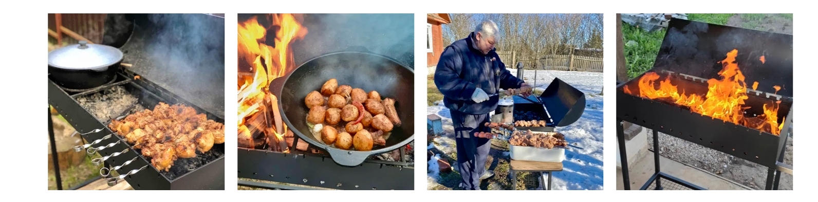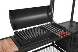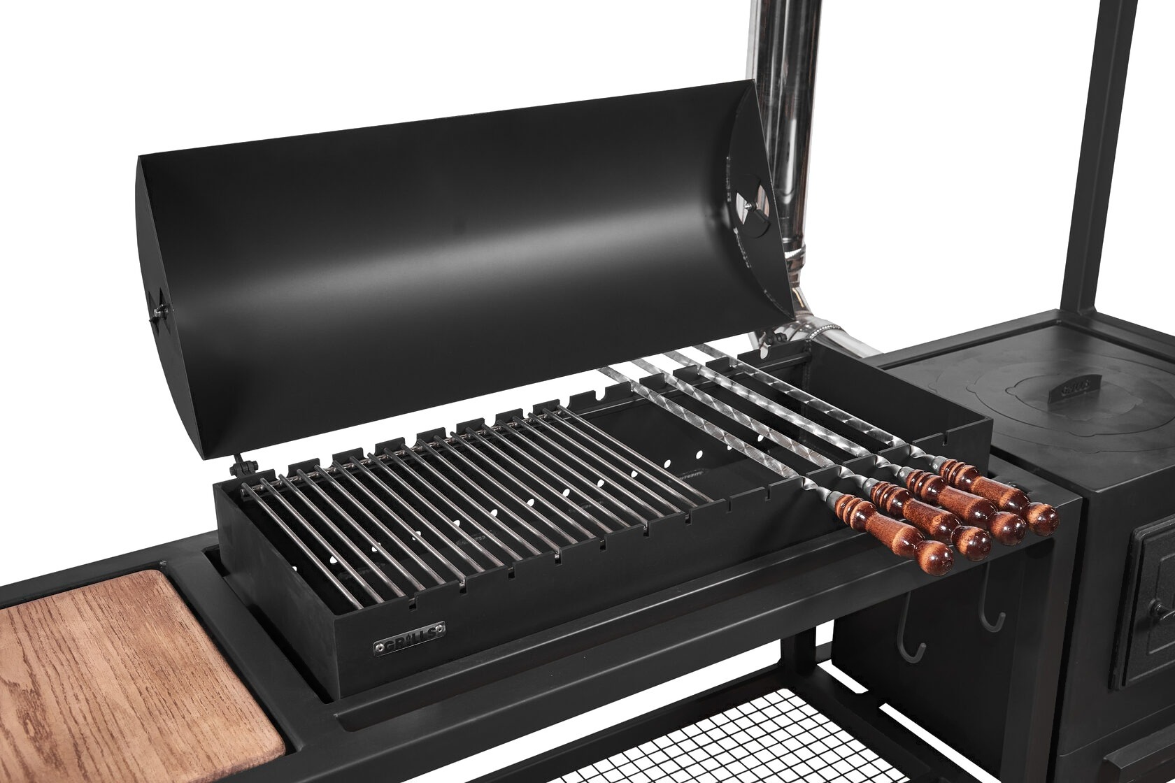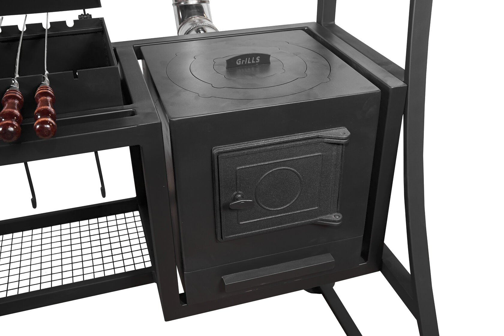 • Оснащение жаровня, крышка, печь, дровница, ножки (4 шт.), крыша, столешница (2 шт.), крючки для аксессуаров, заслонка, дымоход