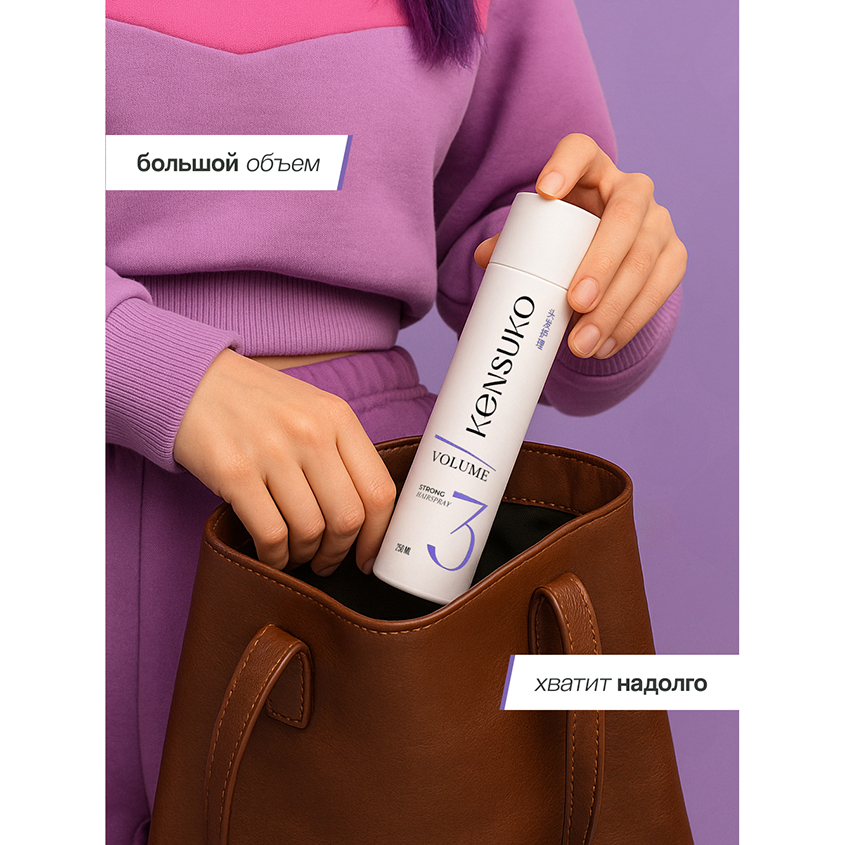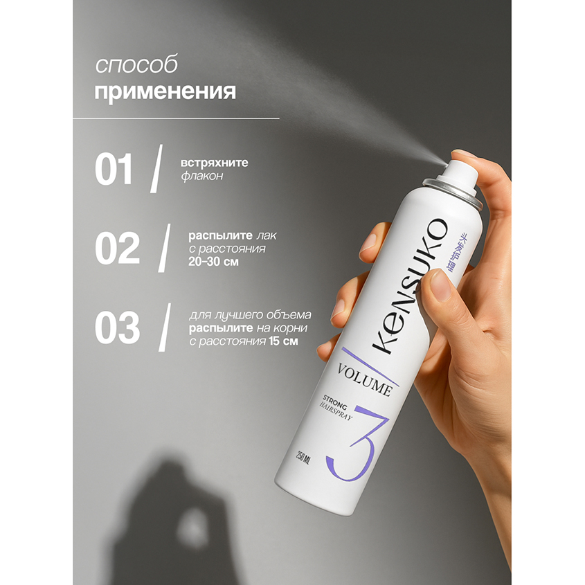 Лак для волос KENSUKO объем и сильная фиксация имеет ультралегкую структуру, которая надежно фиксирует укладку или прическу, создавая естественную невидимую фиксацию, не склеивая волосы, сохраняя прическу естественной и ухоженной. Ингредиенты в составе лака сохраняют укладку при любых погодных условиях. При помощи лака KENSUKO можно фиксировать отдельные пряди, создавая эластичную прическу. Стайлинг очень быстро удаляется с волос как при помощи шампуня, так и посредством вычесывания расческой. Подходит для всех типов волос.