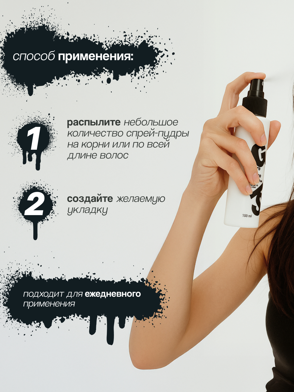 Перед использованием встряхнуть. Распылить небольшое количество спрей-пудры на корни или по всей