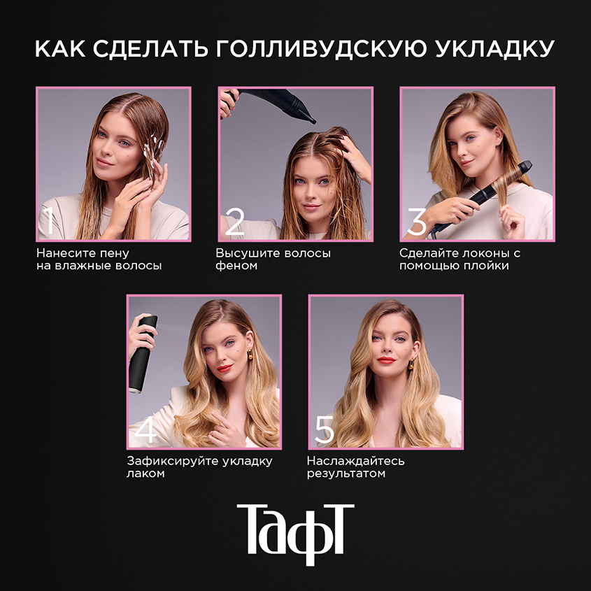 корни волос. Наносить короткими нажатиями. Для достижения оптимального результата используйте пену для укладки волос Тафт Power Нежность Кашемира.