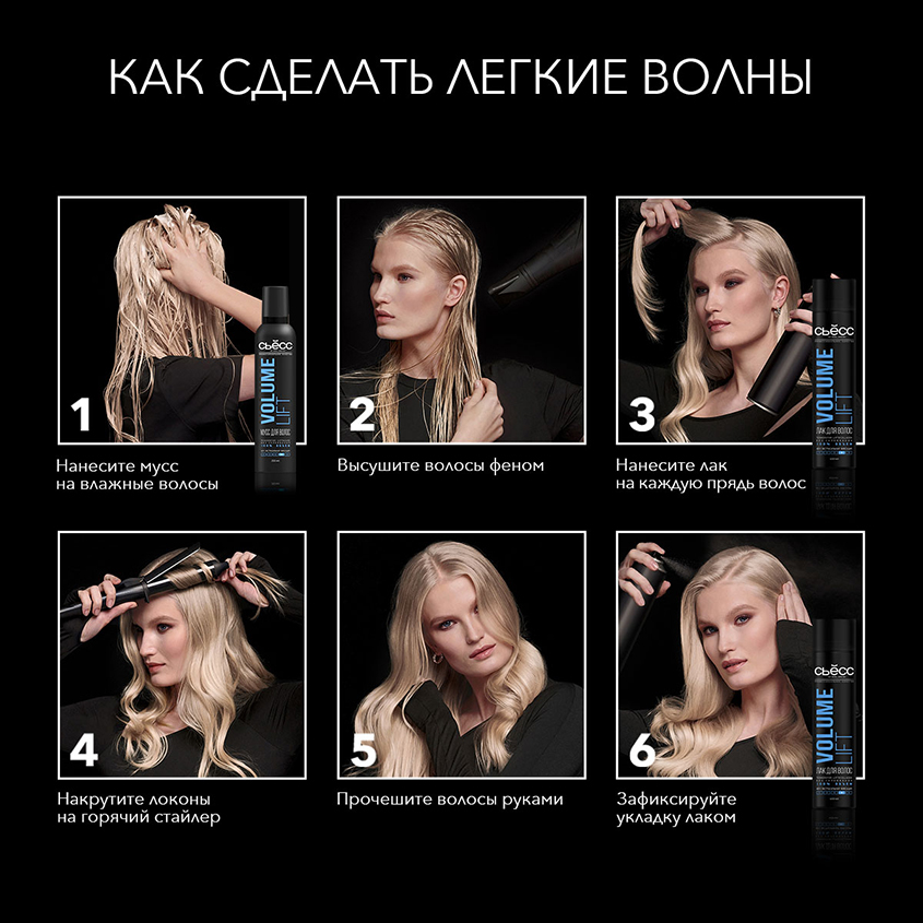 Эксперты СЬЁСС считают, что каждая женщина достойна великолепной укладки. Формулы СЬЁСС разработаны и протестированы профессиональными парикмахерами-стилистами: технология lift & collagen с укрепляющими полимерами придает волосам желаемую форму, обеспечивает стойкий результат на 48 часов и превосходный баланс фиксации и эластичности волос.