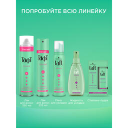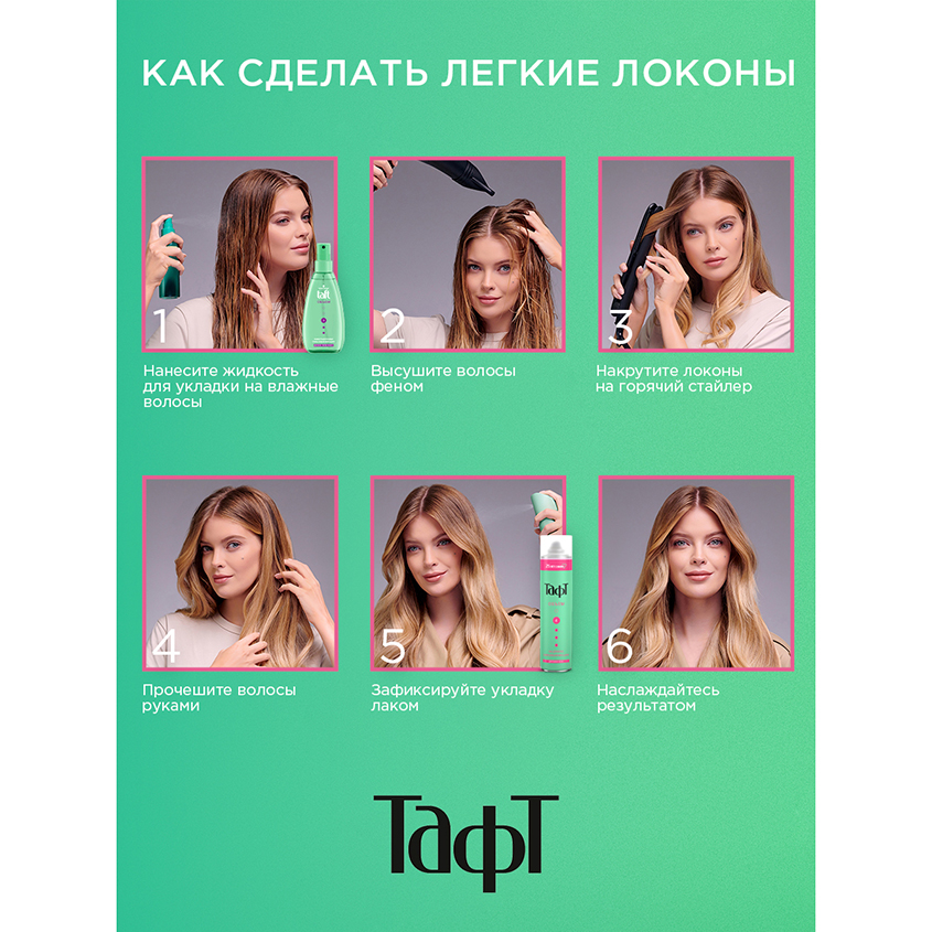распыление на отдельные пряди. Наносить короткими нажатиями. Для оптимального результата используйте пену для укладки волос Тафт Объем очень сильной фиксации или Жидкость для укладки Объем.
