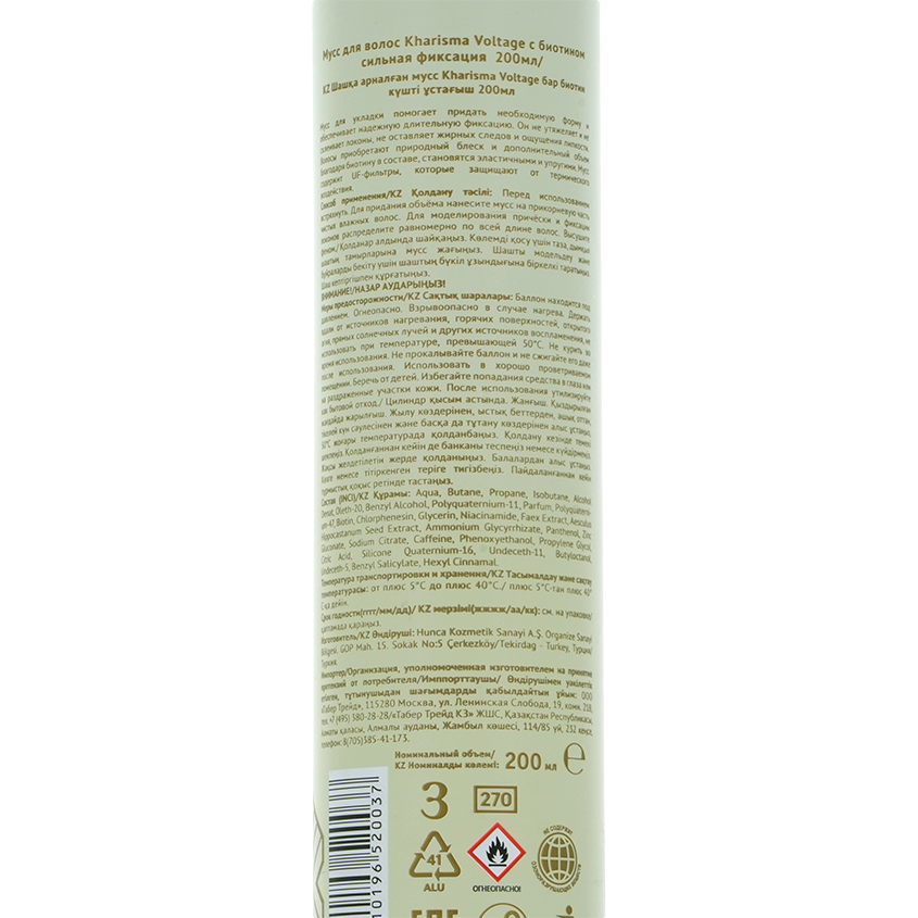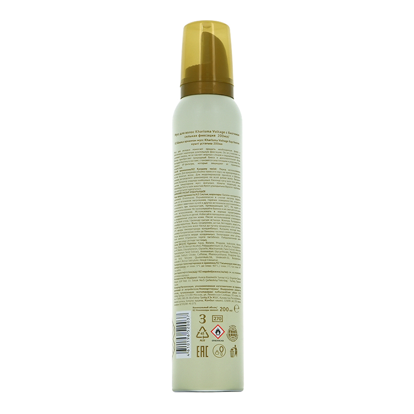 Мусс для укладки KHARISMA VOLTAGE сильной фиксации с биотином помогает придать необходимую форму и обеспечивает надежную длительную фиксацию. Стайлинг не утяжеляет и не склеивает локоны, не оставляет жирных следов и ощущения липкости. Волосы приобретают природный блеск и дополнительный объем благодаря биотину в составе, становятся эластичными и упругими. Мусс для волос содержит UV-фильтры, которые защищают от термического воздействия.