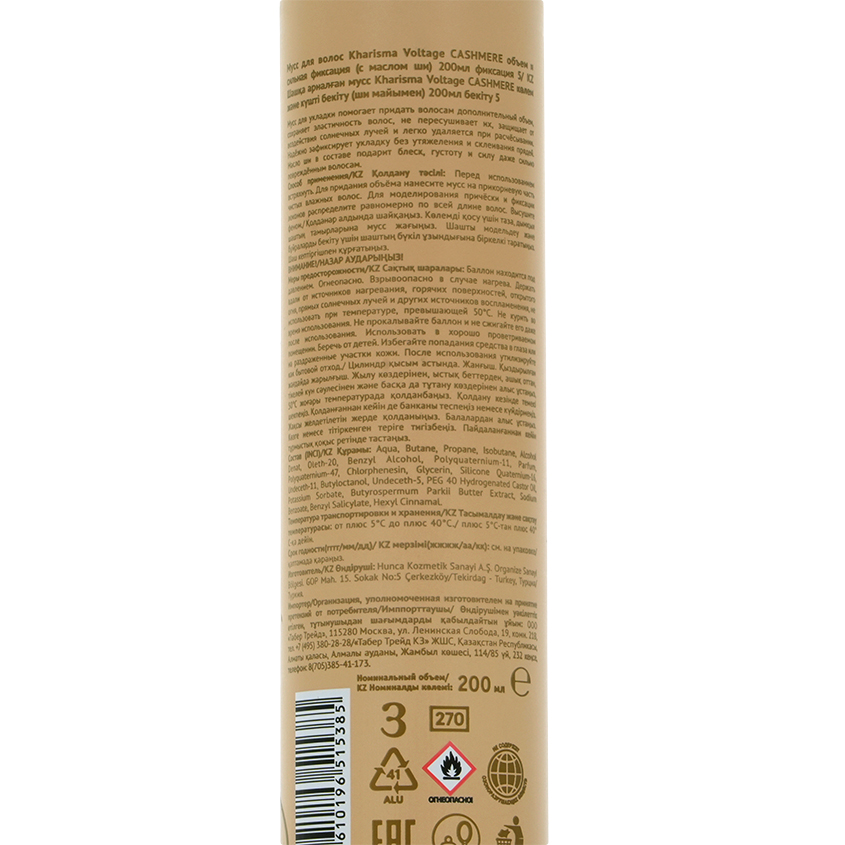 Мусс для волос `KHARISMA VOLTAGE` CASHMERE объем и сильная фиксация (с маслом ши) 200 мл