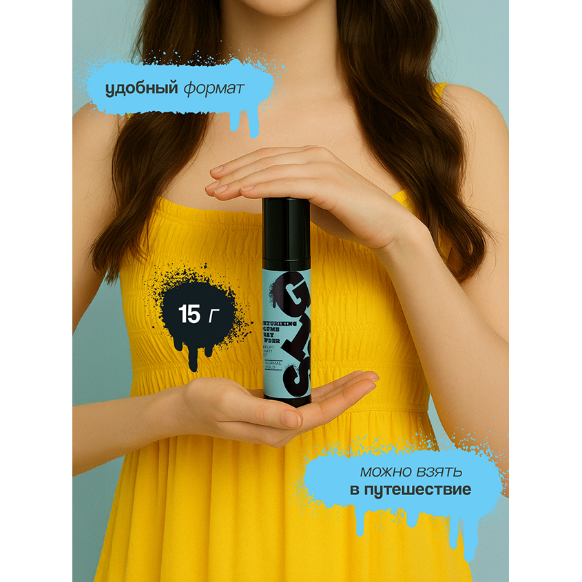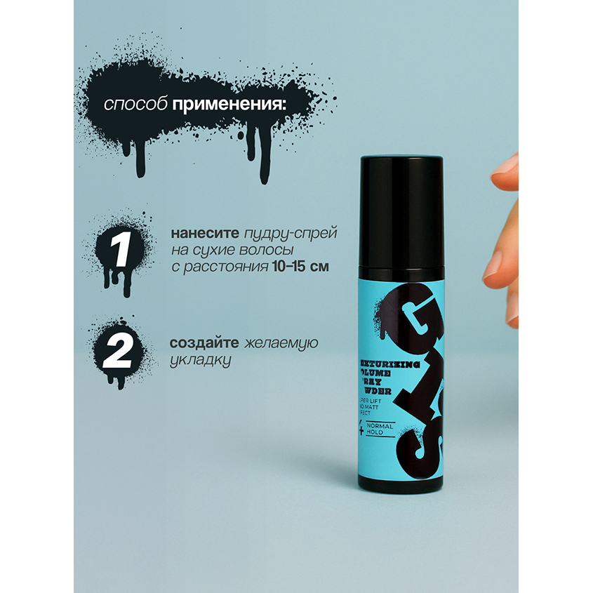 Нанести пудру на сухие волосы с расстояния 10–15 см. Создать желаемую укладку.