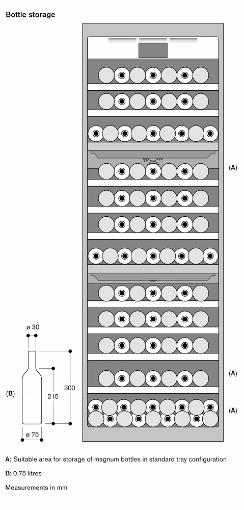Винный холодильник Gaggenau RW466365 имеет несколько температурных зон, в которых одновременно можно хранить разные сорта алкоголя и выставлять разные сочетания настроек. Он встраивается в нишу, что удобно, если у вас ограничен метраж помещения. Количество бутылок, которое можно разместить с учетом полной комплектации и из расчета объема бутылки 0,75 л, — 99 шт.