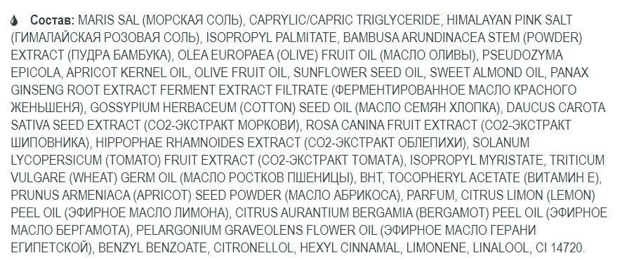 - Активные ингредиенты соль (морская, гамалайская), порошок бамбука, косточки абрикоса, масло женьшеня, масло оливы, масло абрикоса, масло хлопка, экстракт моркови, экстракт шиповника, экстракт облепихи, экстракт томата, масло бергамота, масло лимона, масло герани, токоферол (витамин Е)