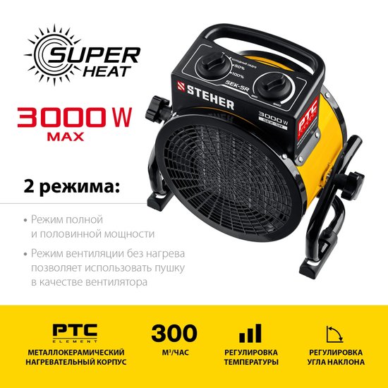 ✅ Электрическая тепловая пушка Steher SEK-5R – это идеальное решение для обогрева небольших помещений. Компактный круглый корпус позволяет легко переносить и хранить устройство, что делает его удобным для использования в различных условиях. ✅ Оснащенная долговечным металлокерамическим нагревательным элементом, эта тепловая пушка обеспечивает быстрый и равномерный нагрев, при этом экономно расходуя электроэнергию и не суша воздух. Механический терморегулятор позволяет поддерживать желаемую температуру, что делает использование устройства комфортным и эффективным.✅ Благодаря большой площади теплообмена и низкой температуре нагрева элемента, воздух прогревается быстро и равномерно. Вы можете оставлять тепловую пушку включенной на длительное время, не беспокоясь о безопасности помещения, так как предусмотрены надежные защитные меры.⚠️ Эта тепловая пушка идеально подходит для генерации горячего воздуха, который можно использовать для обогрева, сушки бытовых и промышленных помещений.✅ Преимущества Steher SEK-5R включают:- Безопасный направленный обогрев- Долговечный керамический нагревательный элемент- Экономичный расход электроэнергии- Компактные размеры и легкий вес для удобства перемещения- Двойная защита от перегрева с термопредохранителем и терморегулятором- Плавная регулировка температуры для вашего комфорта- Мощный вентилятор, который увеличивает теплоотдачу за счет большого объема прокачиваемого воздухаЭта тепловая пушка станет надежным помощником в холодное время года, обеспечивая тепло и комфорт в вашем доме или на рабочем месте.✅ Электрическая тепловая пушка Steher SEK-5R – это идеальное решение для обогрева небольших помещений. Компактный круглый корпус позволяет легко переносить и хранить устройство, что делает его удобным для использования в различных условиях. ✅ Оснащенная долговечным металлокерамическим нагревательным элементом, эта тепловая пушка обеспечивает быстрый и равномерный нагрев, при этом экономно расходуя электроэнергию и не суша воздух. Механический терморегулятор позволяет поддерживать желаемую температуру, что делает использование устройства комфортным и эффективным.✅ Благодаря большой площади теплообмена и низкой температуре нагрева элемента, воздух прогревается быстро и равномерно. Вы можете оставлять тепловую пушку включенной на длительное время, не беспокоясь о безопасности помещения, так как предусмотрены надежные защитные меры.⚠️ Эта тепловая пушка идеально подходит для генерации горячего воздуха, который можно использовать для обогрева, сушки бытовых и промышленных помещений.✅ Преимущества Steher SEK-5R включают:- Безопасный направленный обогрев- Долговечный керамический нагревательный элемент- Экономичный расход электроэнергии- Компактные размеры и легкий вес для удобства перемещения- Двойная защита от перегрева с термопредохранителем и терморегулятором- Плавная регулировка температуры для вашего комфорта- Мощный вентилятор, который увеличивает теплоотдачу за счет большого объема прокачиваемого воздухаЭта тепловая пушка станет надежным помощником в холодное время года, обеспечивая тепло и комфорт в вашем доме или на рабочем месте.