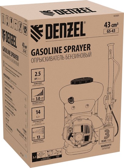 • Комплектация - Опрыскиватель бензиновый 1 шт - Труба гибкая 1 шт - Труба напорная (тип А) 1 шт - Труба напорная (тип Б) 1 шт - Распылитель в сборе 1 шт - Отвертка 1 шт - Шестигранный ключ 2 шт - Свечной ключ 1 шт - Хомут гибкой трубы 2 шт - Прокладка бака распыляемого вещества 1 шт - Сумка для инструментов 1 шт - Дозатор для приготовления смеси 1 шт - Руководство пользователя с гарантийным талоном 1 шт