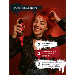 фиксации нанести средство с расстояния 20–30 см. Для увеличения объема приподнять прядь волос и распылить средство на корни с расстояния 15 см.