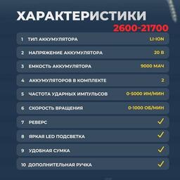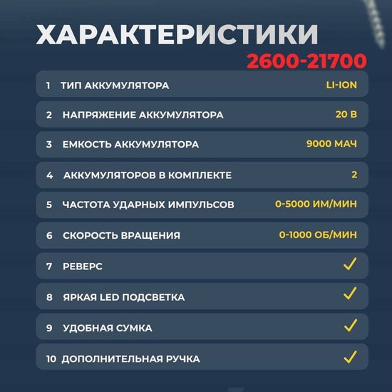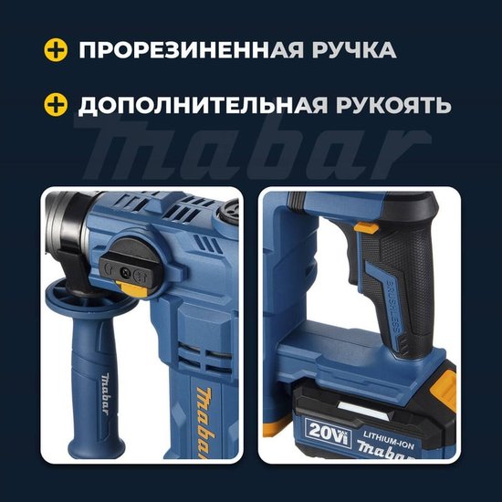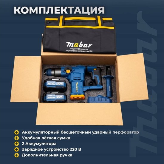 • Комплект поставки - Перфоратор,- 2 аккумулятора,- зарядное устройство,- ручка держатель,- сумка для хранения,- коробка для транспортировки.