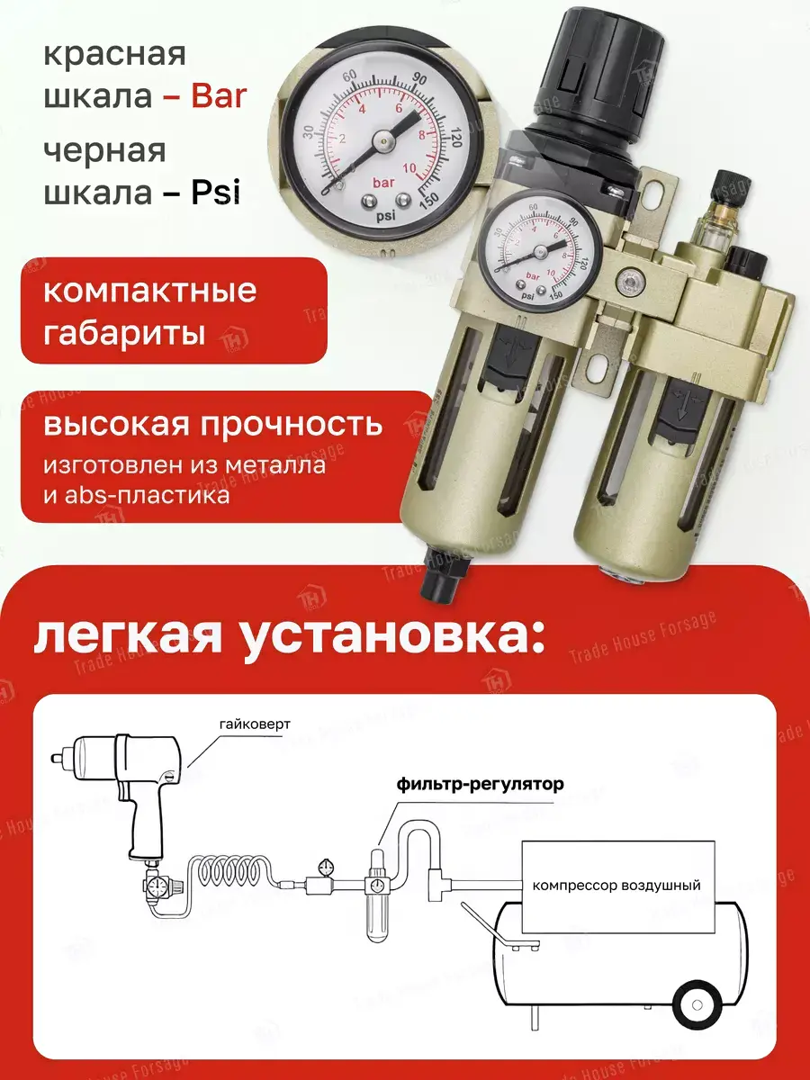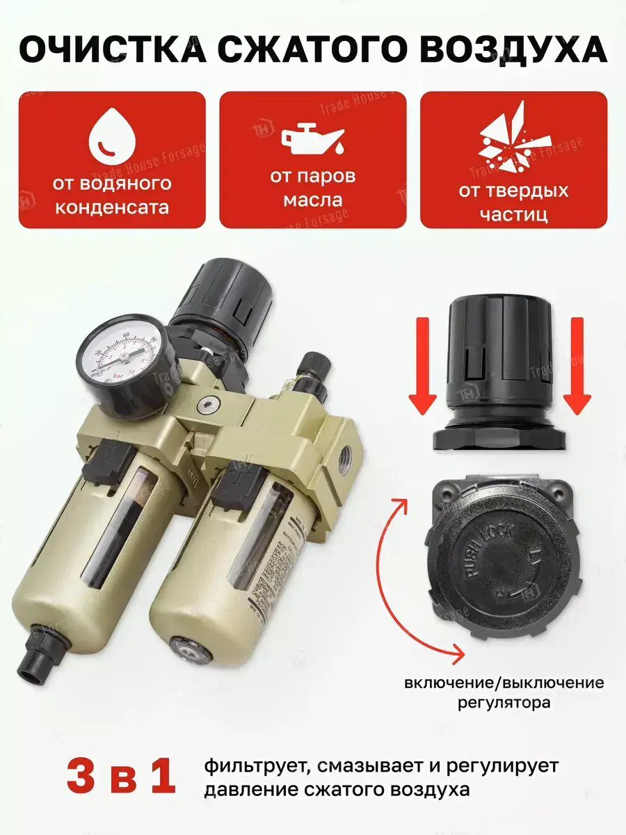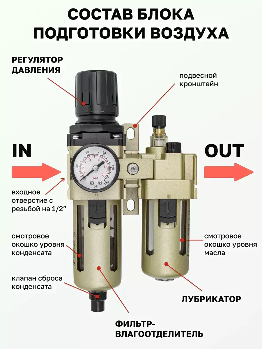 • Комплектация блока фильтр, регулятор давления, лубрикатор, манометр