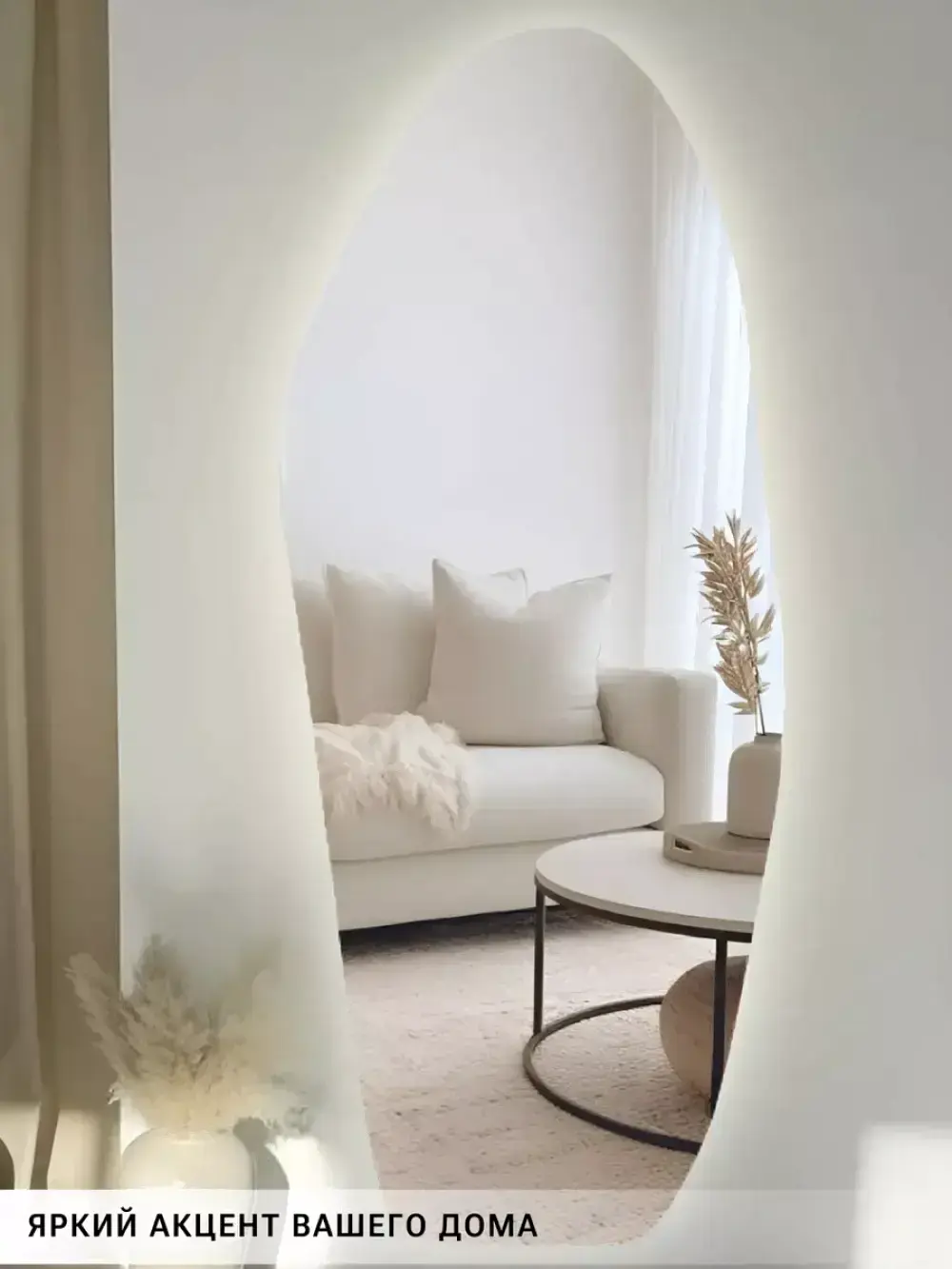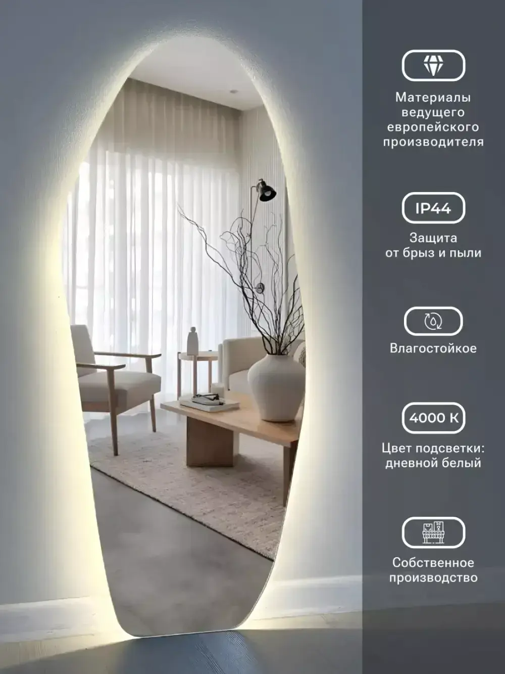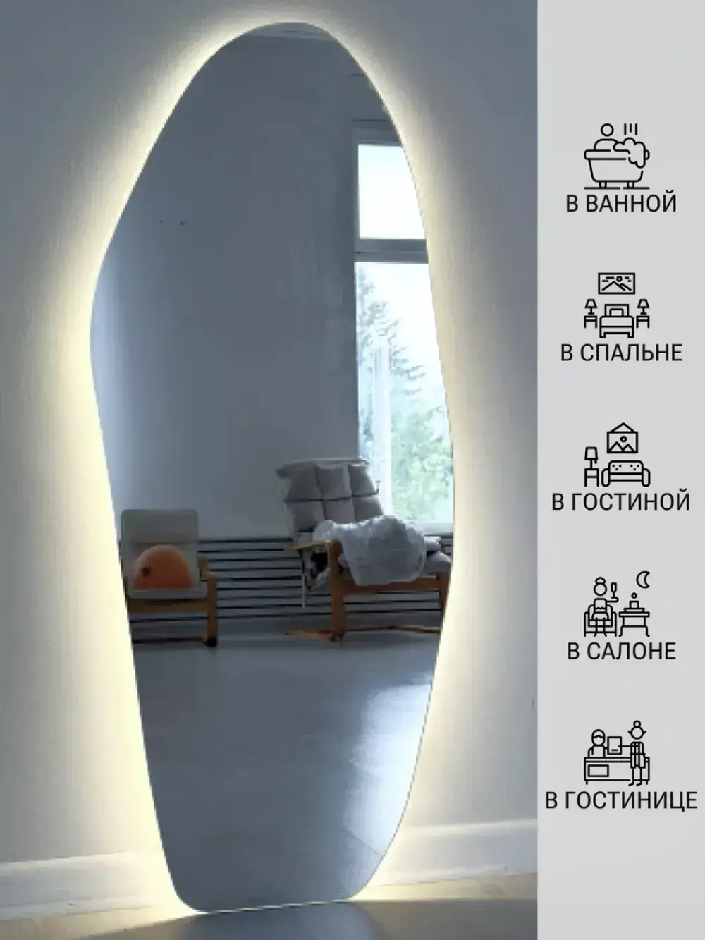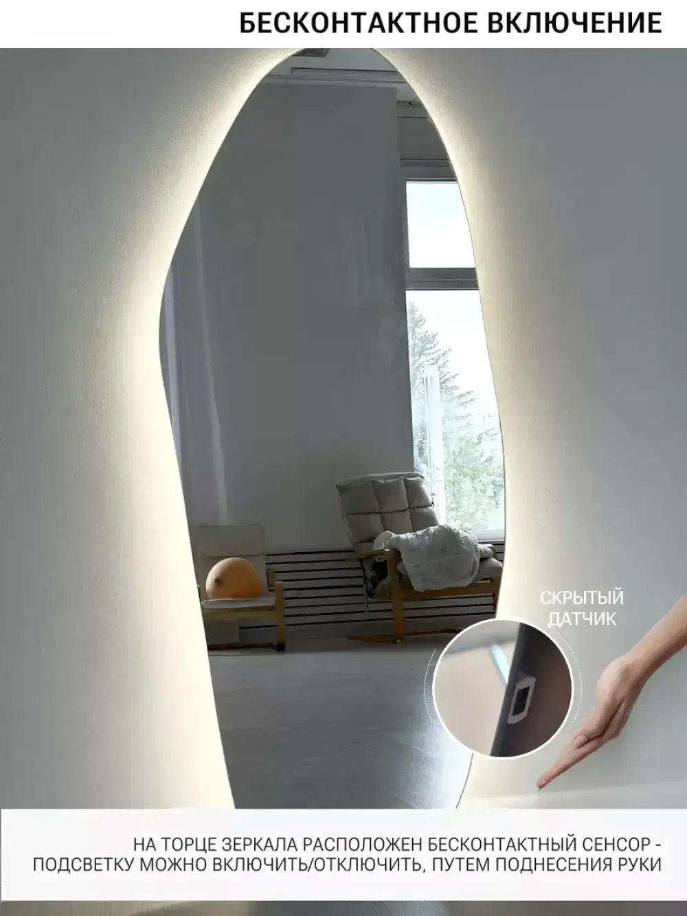 • Дизайн шлифованная кромка, подсветка по периметру, свечение по стене