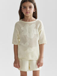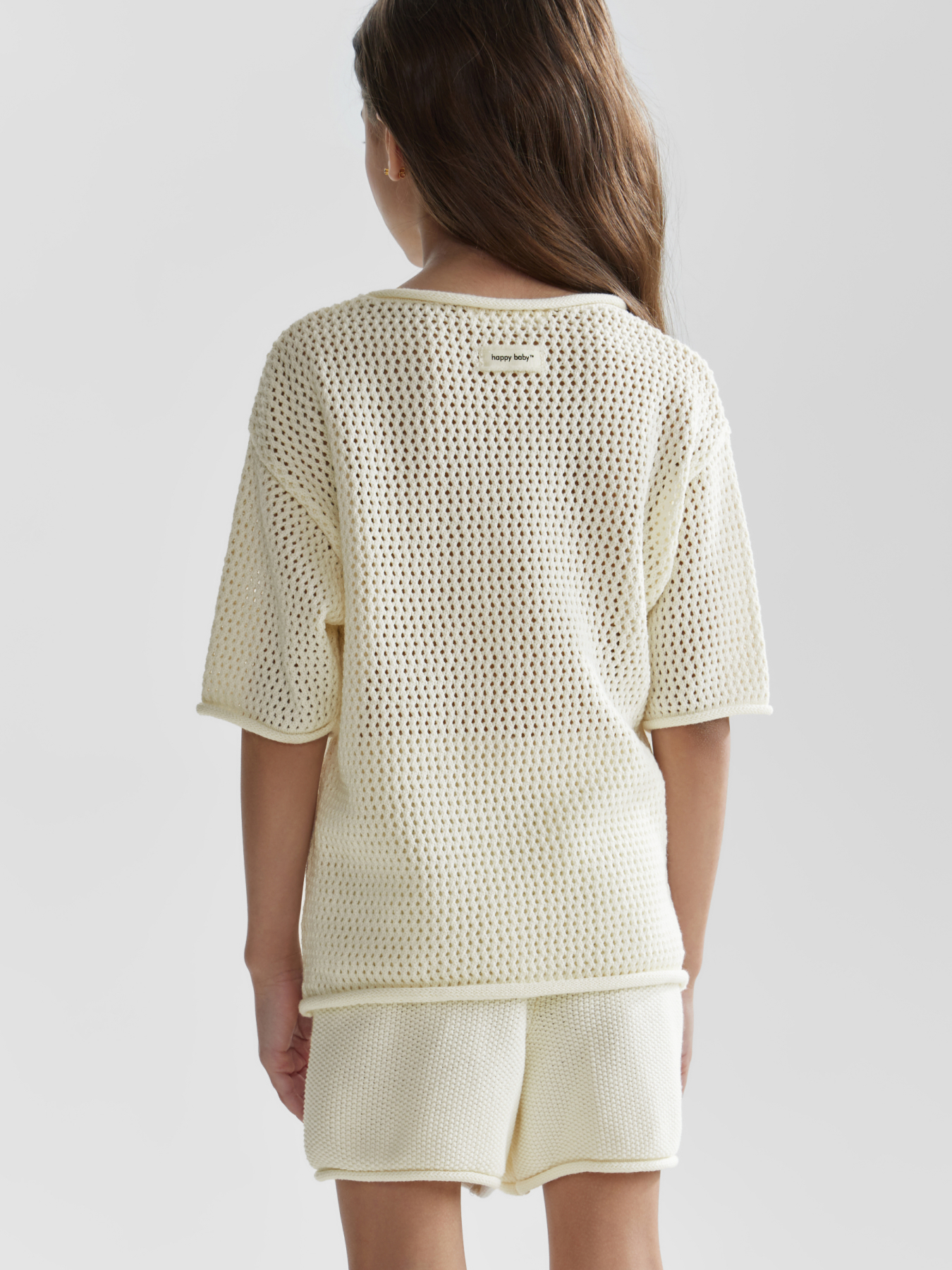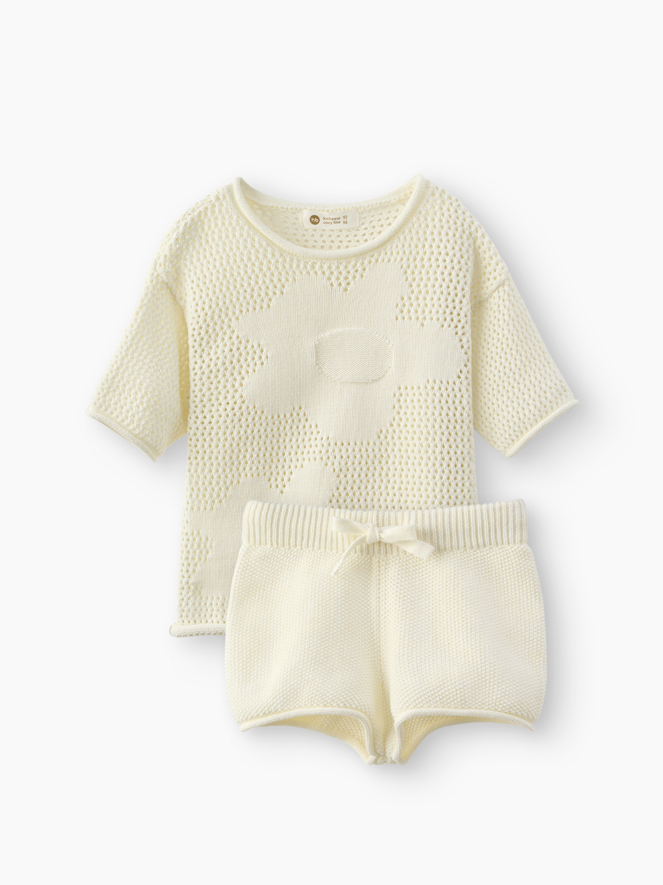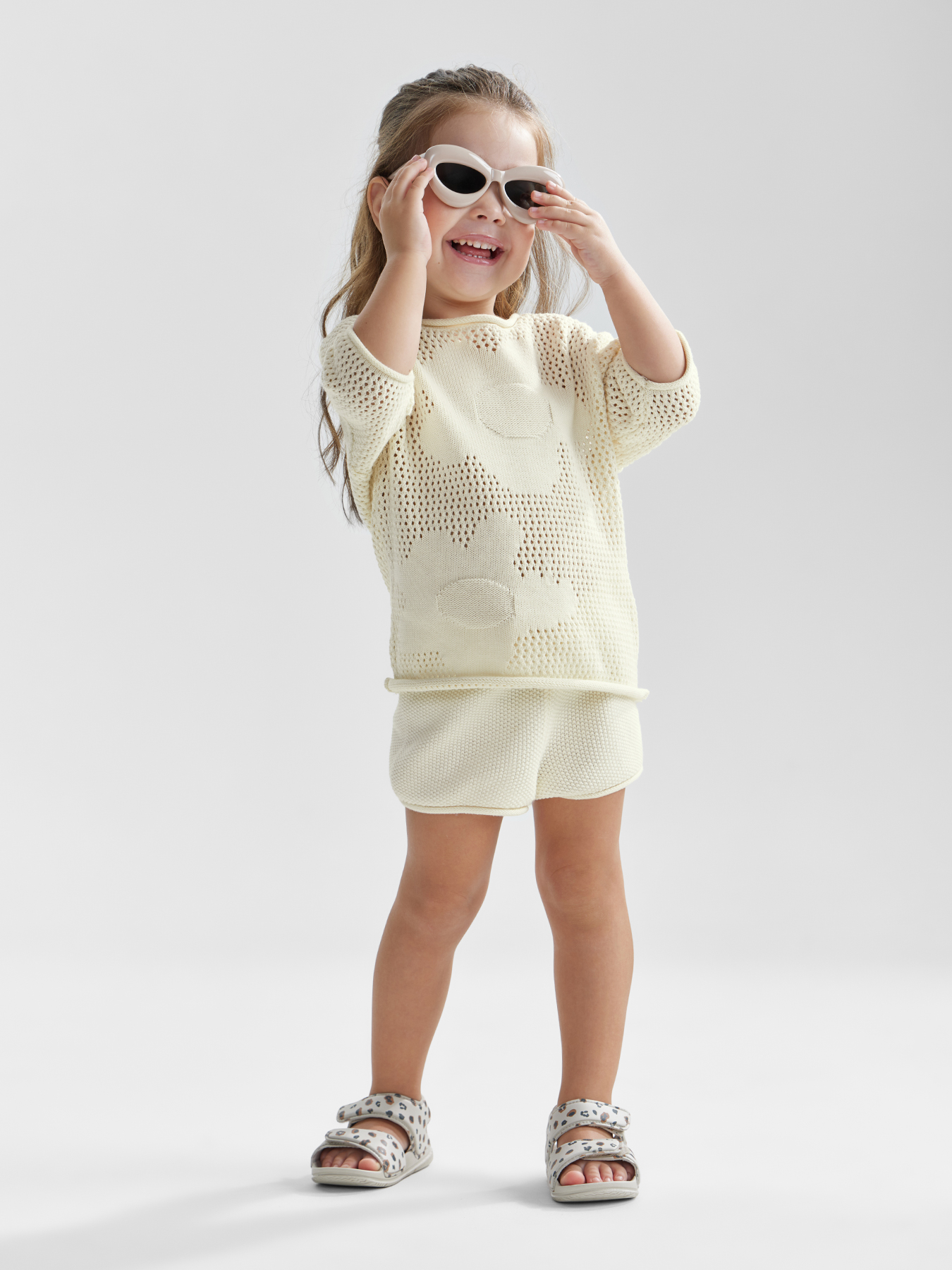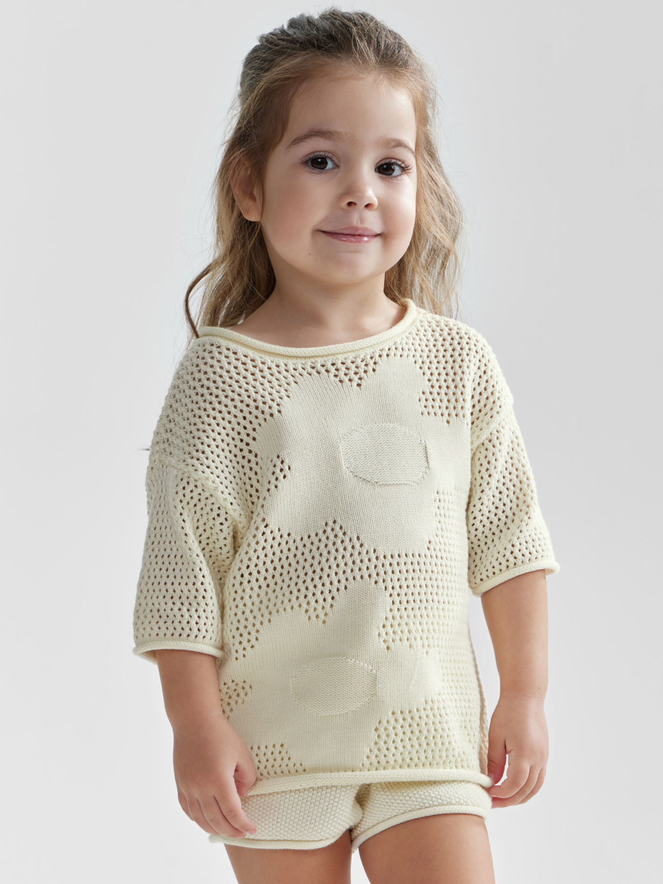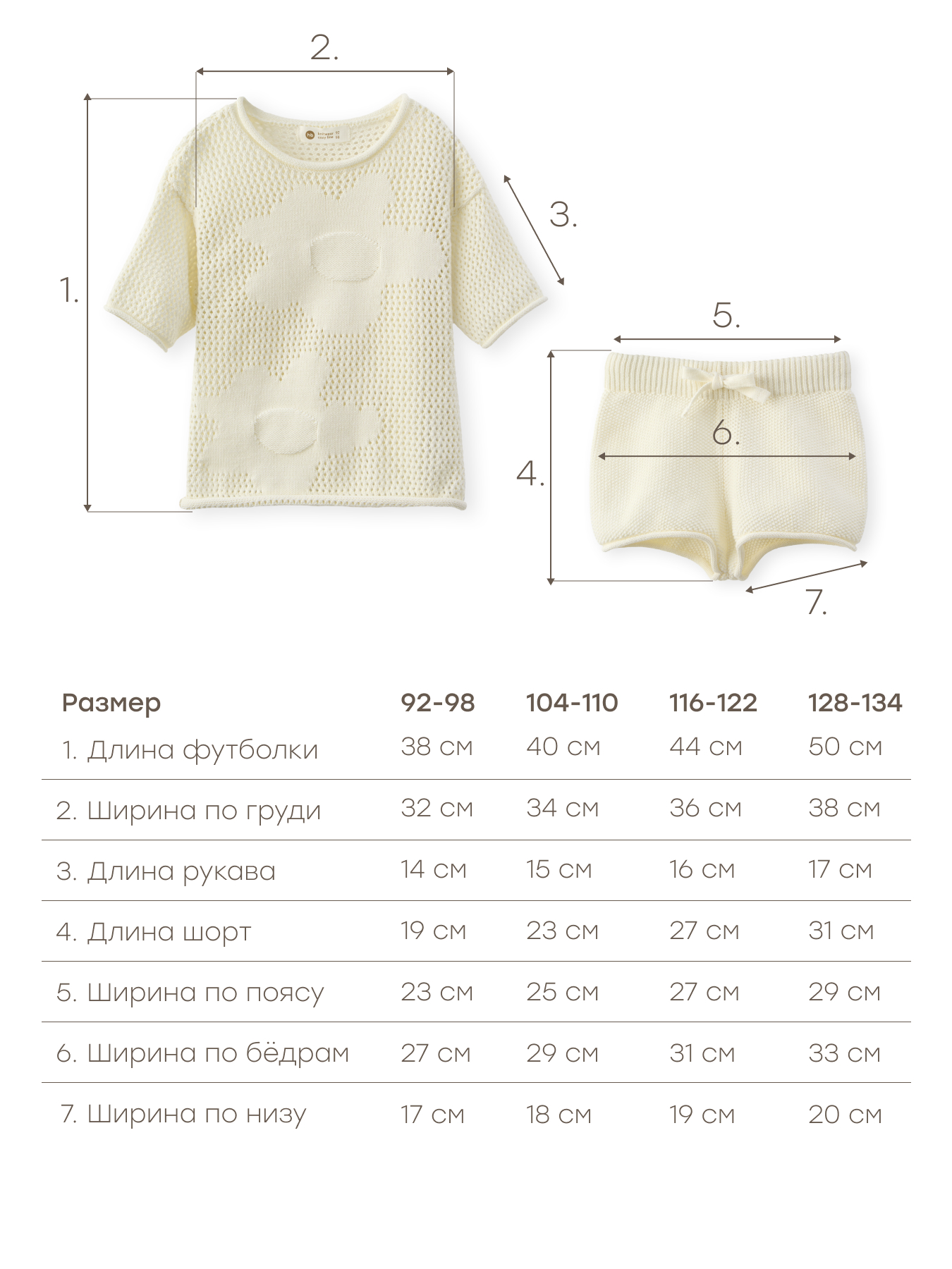 Летний костюм для девочки, состоящий из свободной футболки и удобных шорт, станет идеальным выбором для теплого времени года. Комплект одежды создан из мягкой хлопковой ткани, которая обеспечивает комфорт при носке и позволяет коже дышать даже в жаркую погоду. Необычная вязаная ткань с рисунком из больших цветов и спущенная линия плеч отсылают к стилю y2k, что добавляет современности и делает его привлекательным для юных модниц. Шорты с завязками помогут легко отрегулировать посадку, обеспечивая удобство движения. Такой твинсет для девочки идеально подойдет как для активных прогулок на свежем воздухе, так и для отдыха дома. Это отличный вариант для похода в детский садик. Позвольте малышке чувствовать себя уверенно и модно c Happy Baby.