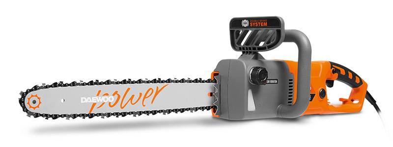 ОсобенностиЭлектрический двигатель Daewoo; Корпус из ударопрочного пластика ABS; Эргономичная рукоятка с прорезиненной накладкой; Плавный пуск двигателя; Металлический зубчатый упор; Система быстрой установки и натяжения цепи SDS; Индикатор уровня цепного масла; Защита от случайного включения