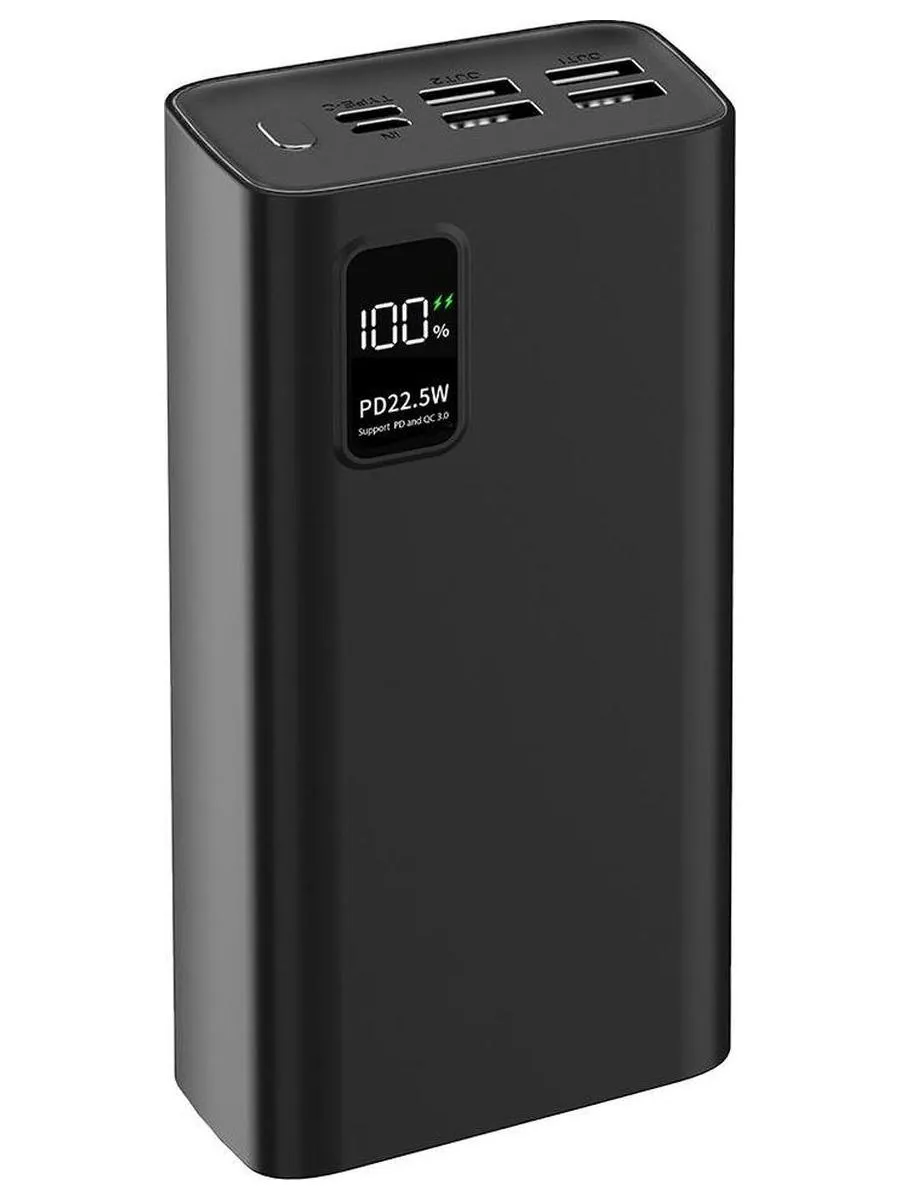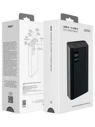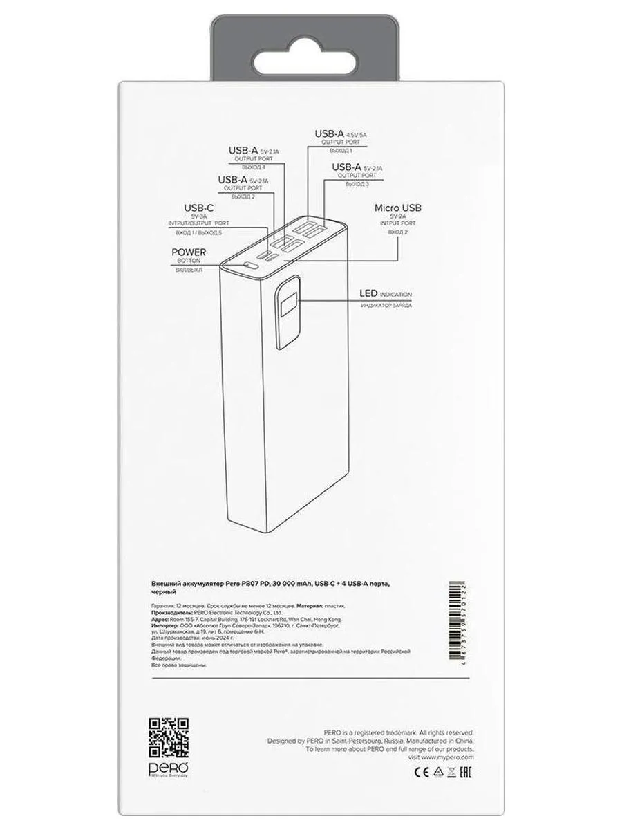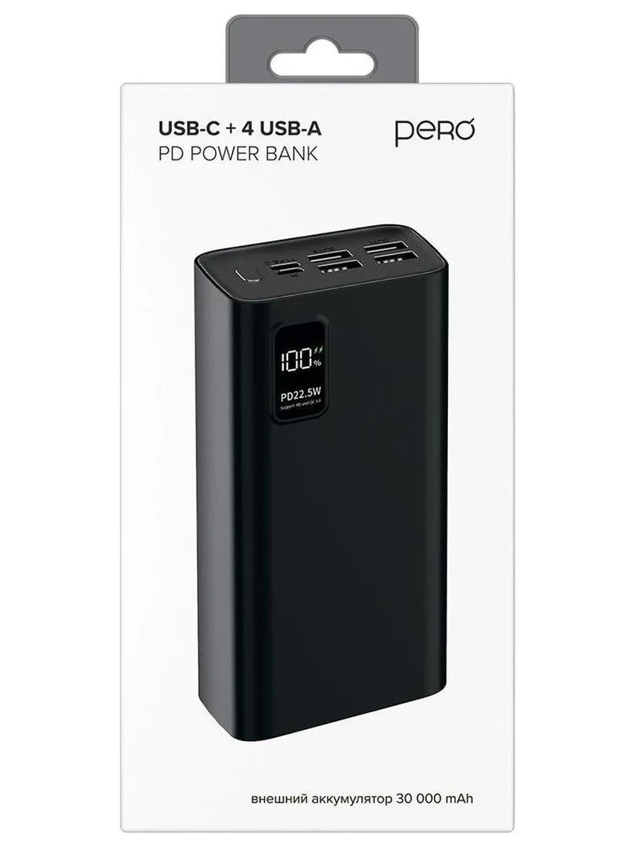 Описание товара Внешний аккумулятор PERO PB07 30000 mAh, Li-Pol, output USB-C + 4 USB-A, черный