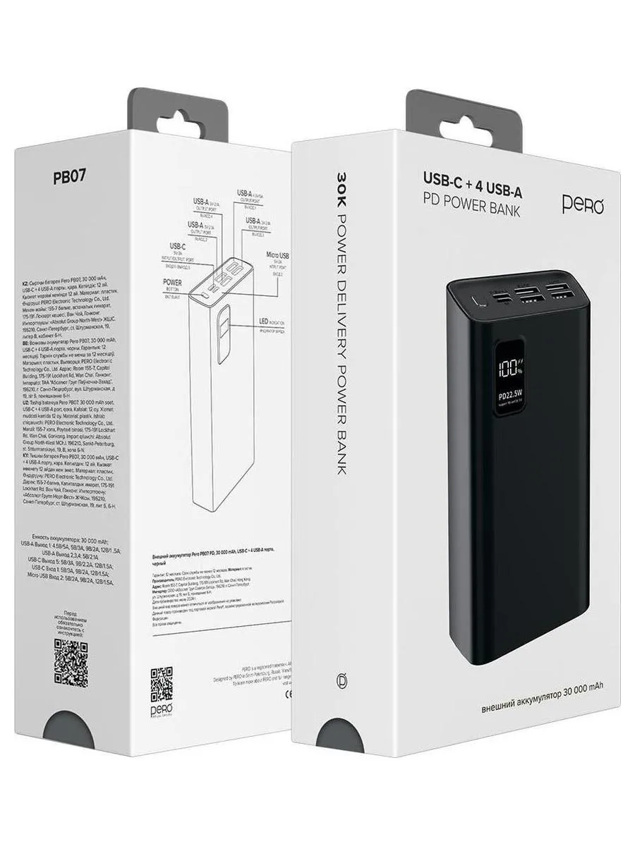 внешний аккумулятор pero pb07 30000 mah, li-pol, output usb-c + 4 usb-a, черный.