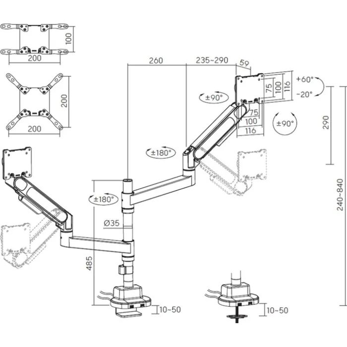 Особливостіз портом USB-С , з портом USB-A , з регулюванням глибини , з USB-концентратором , обертання: ±180° , з прихованим укладанням дротів , для кріплення вигнутих екранів , з регулюванням по висоті