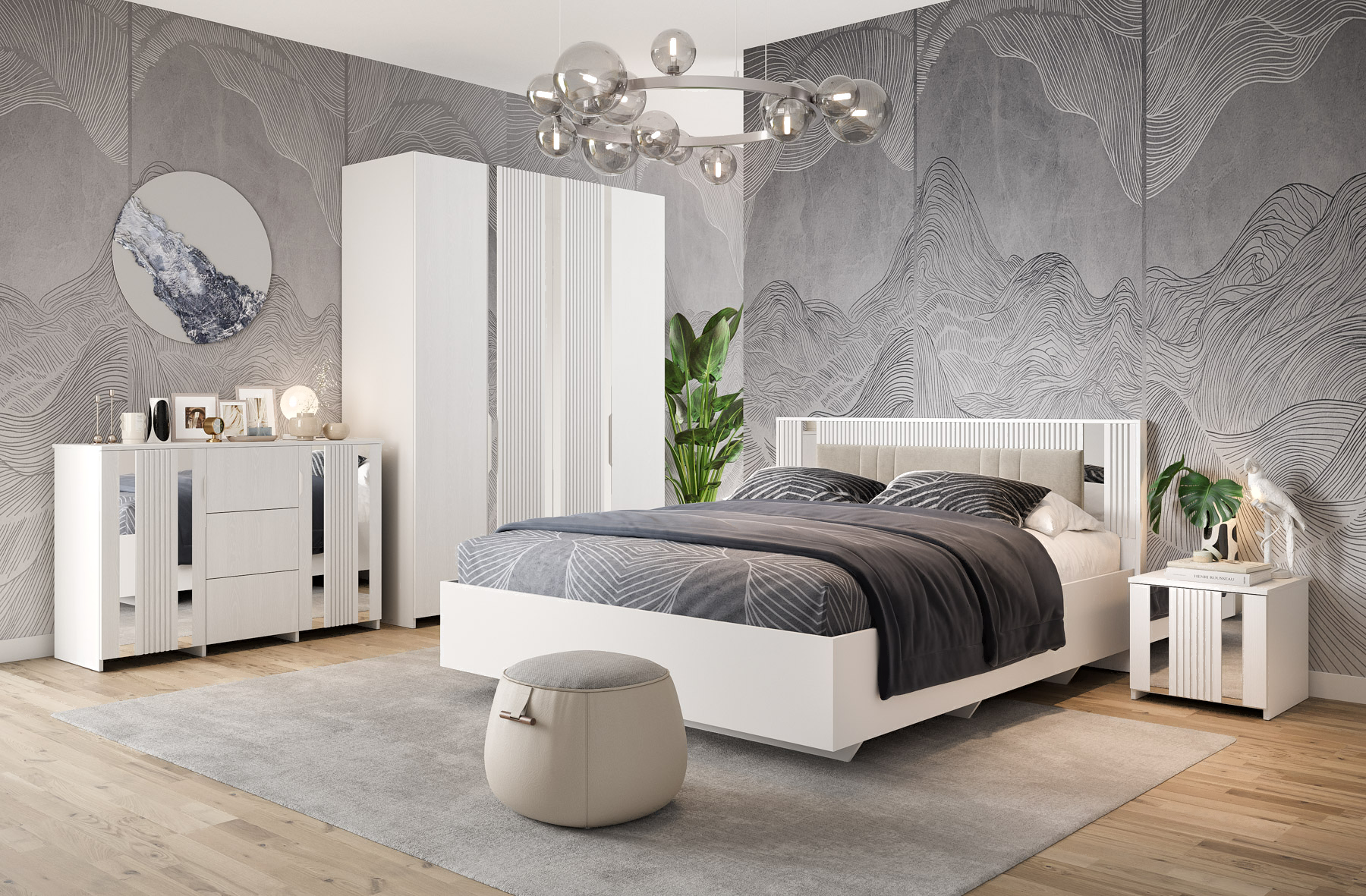 - Состав комплекта двуспальная кровать, тумба (2 шт), комод, шкаф