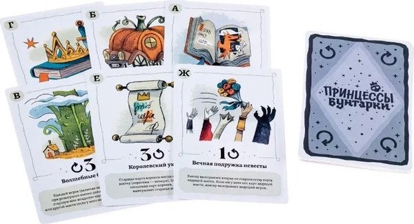 - Комплектация 12 карт королев,12 карт фей,12 карт питомцев,12 карт лягушек,12 карт принцев,26 карт раундов,12 карт принцесс,Блокнот,Правила игры.
