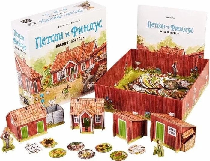 • Комплектация Коробка, которая будет двором ПетсонаДвусторонние жетоны беспорядка — 60 шт.Двусторонние жетоны заданий — 8 шт.Сборные домики — 4 шт.Фигурка ФиндусаФигурка ПетсонаПравила игры