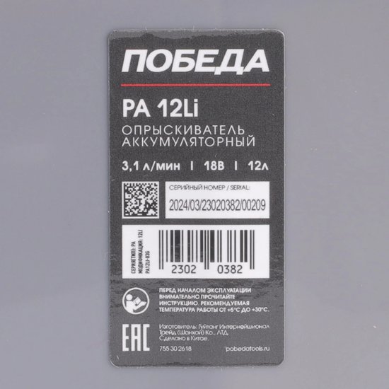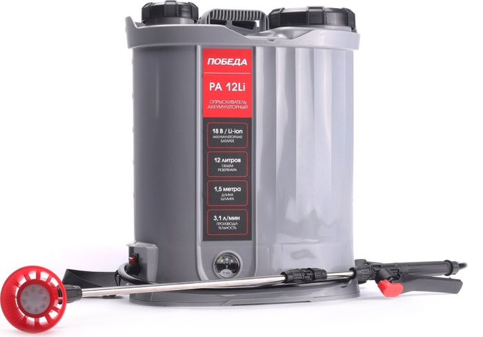Комплектация- опрыскиватель; - штанга; - фильтр; - распылительные насадки: 4 шт.; - инструкция по эксплуатации; аккумуляторная батарея и зарядное устройство в комплект НЕ входят.
