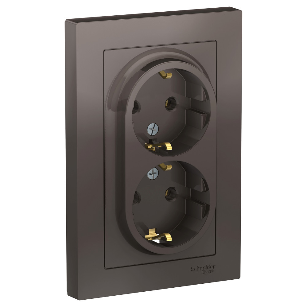 Розетка двойная Systeme Electric (ранее Schneider Electric) серии AtlasDesign (в сборе, цвет мокко) с заземлением, без шторок подходит для сетей 250 В, на ток 16 А. - Заземляющий контакт обеспечивает дополнительную защиту от удара электрическим током. - Лицевые детали из качественного ABS-пластика, устойчивого к царапинам и УФ-излучению. - Двойная розетка позволяет подключить два устройства в одном месте. - Изделие поставляется в комплекте с рамкой того же цвета.