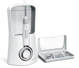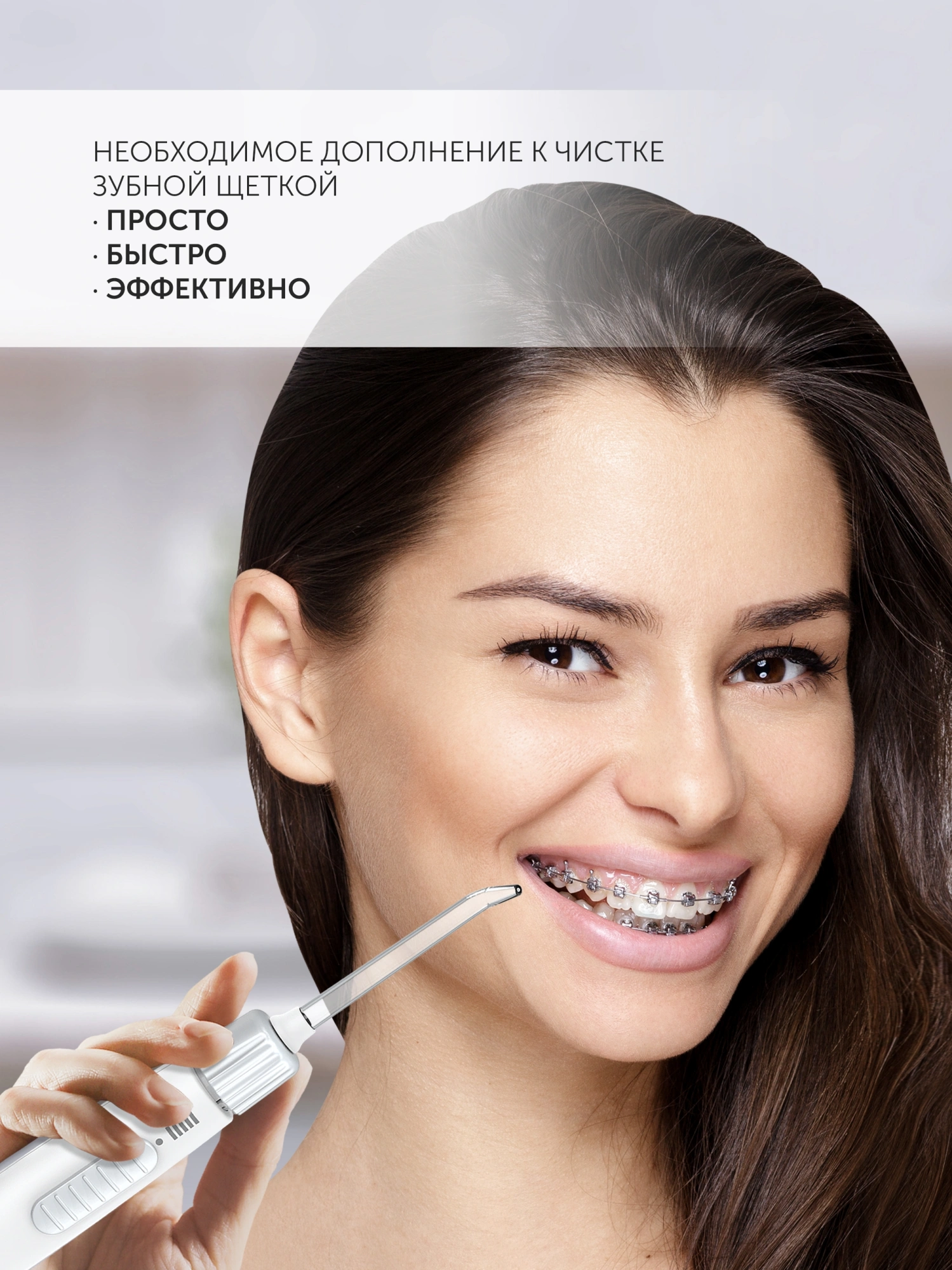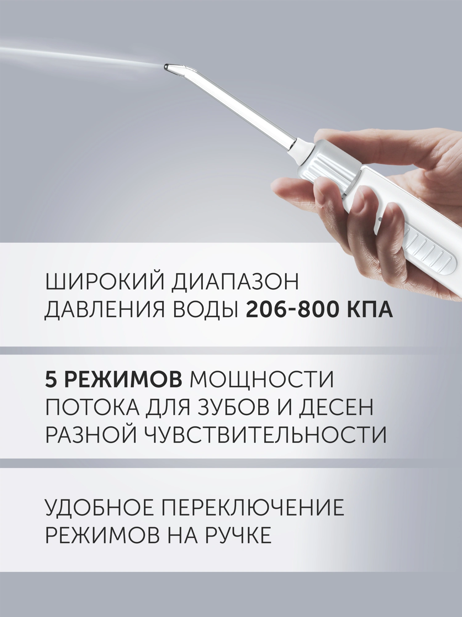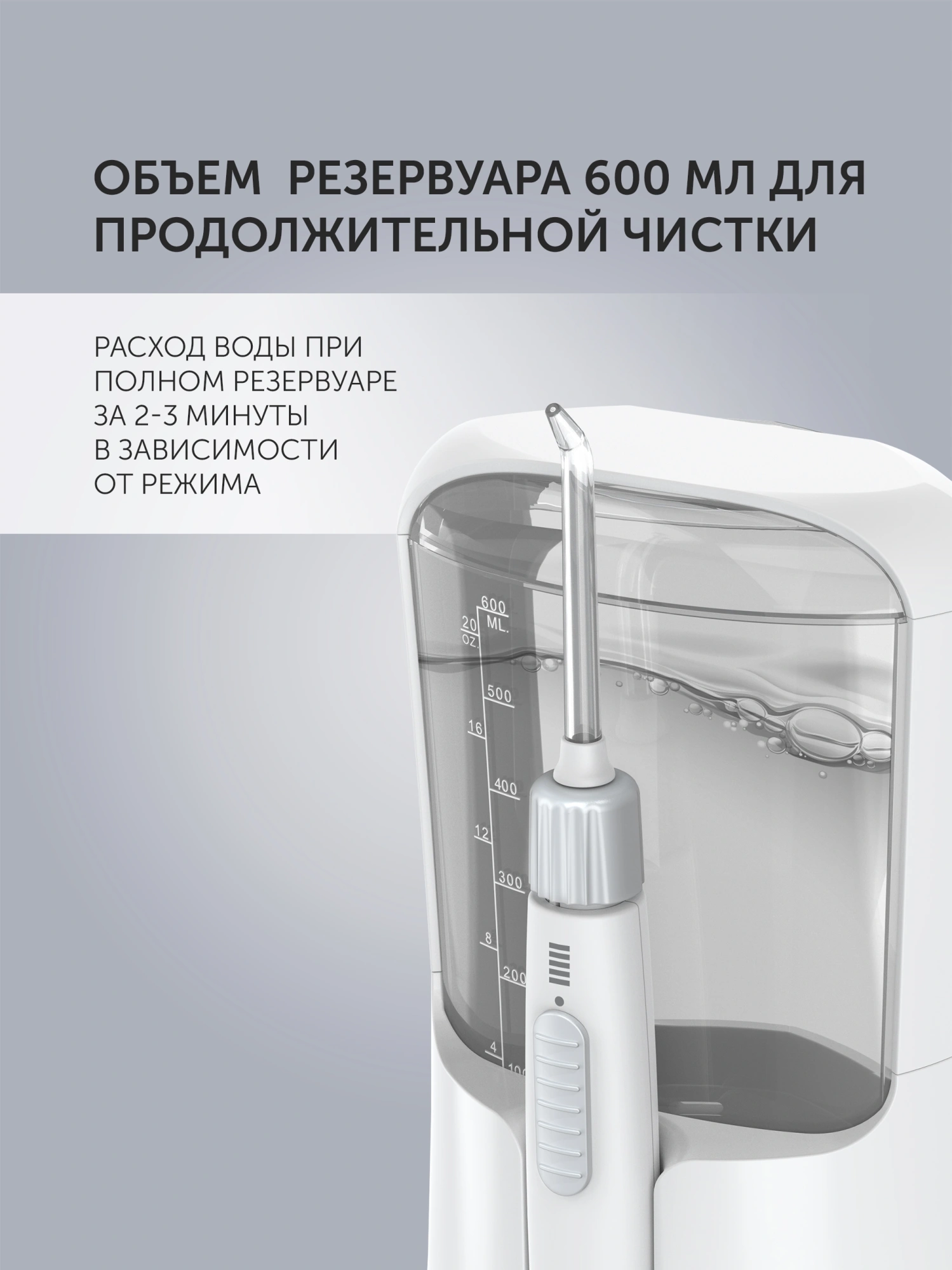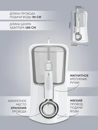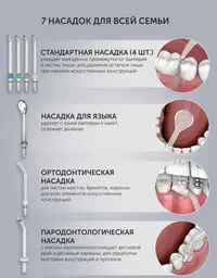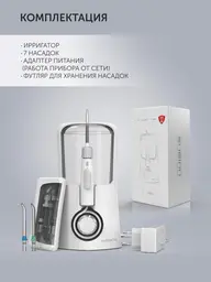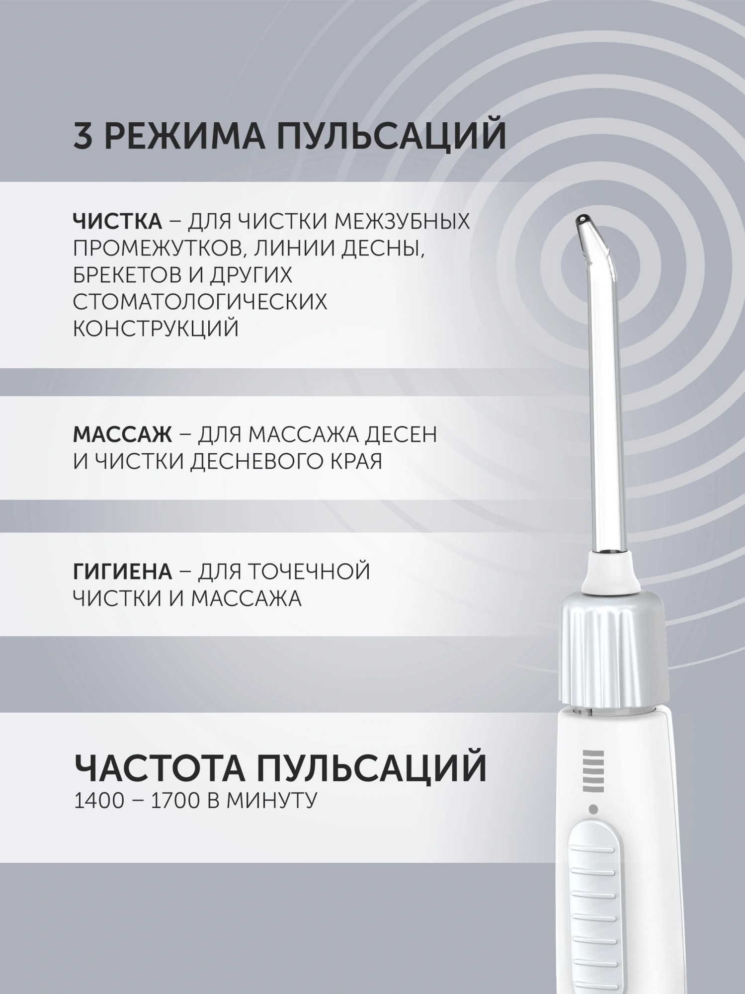 Особенности3 режима пульсаций: чистка, массаж, гигиена; 5 режимов давления воды; количество пользователей: от 1 до 4; насадки в комплекте: 4 стандартные, 1 ортодонтическая, 1 пародонтологическая, 1 для языка; автоматическое отключение через 3 минуты; питание от сети; футляр для хранения насадок.
