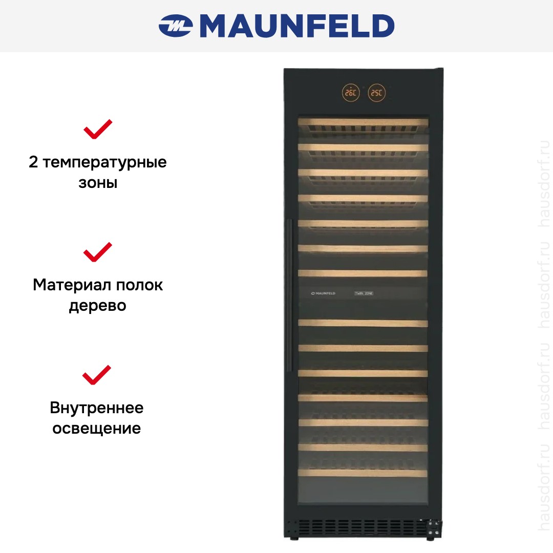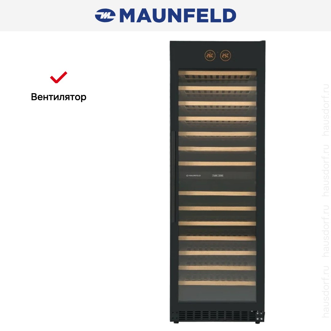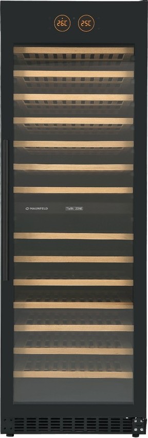 Винный холодильник Maunfeld MBWC-415D171 имеет две температурные зоны, в которых одновременно можно хранить разные сорта алкоголя и выставлять разные сочетания настроек. Он встраивается в нишу, что удобно, если у вас ограничен метраж помещения. Количество бутылок, которое можно разместить с учетом полной комплектации и из расчета объема бутылки 0,75 л, — 171 шт.