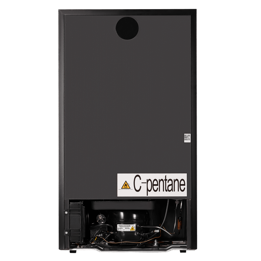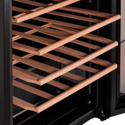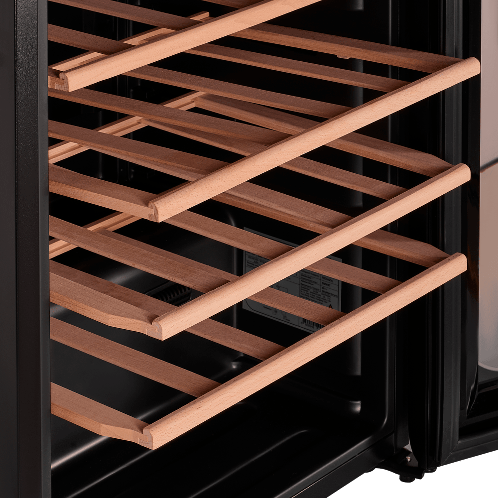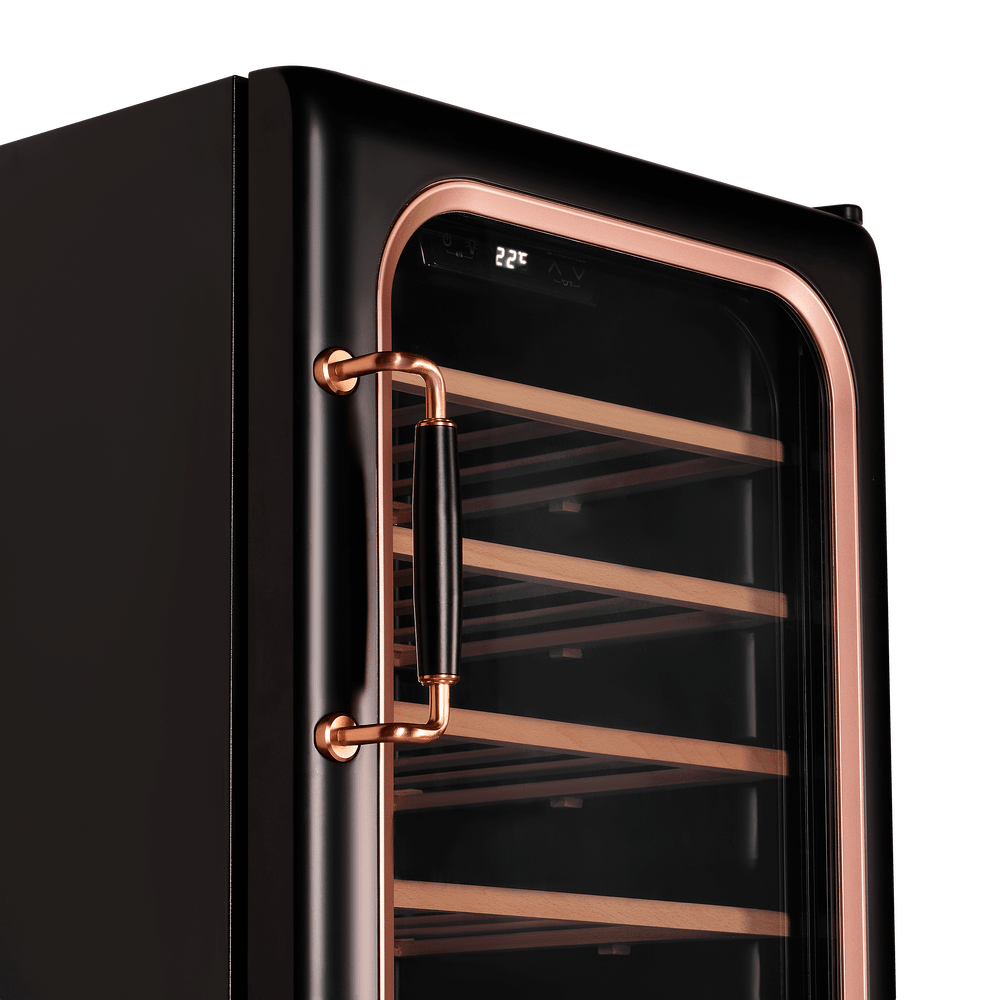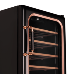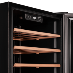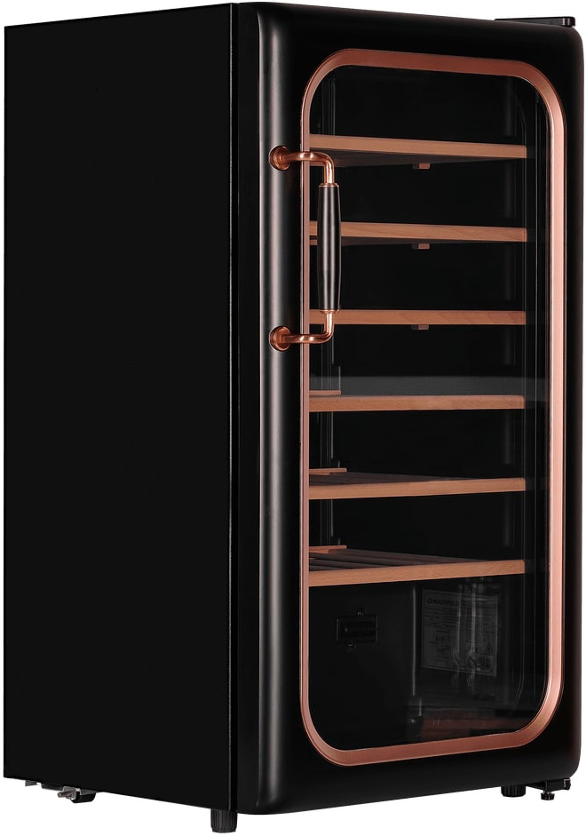 Стеклянная дверь — дополнительный изящный штрих к общему дизайну модели. Специальное покрытие защищает вино от влияния ультрафиолетовых лучей, которые проникают, если шкаф находится в солнечной комнате. Цвет корпуса — черный.