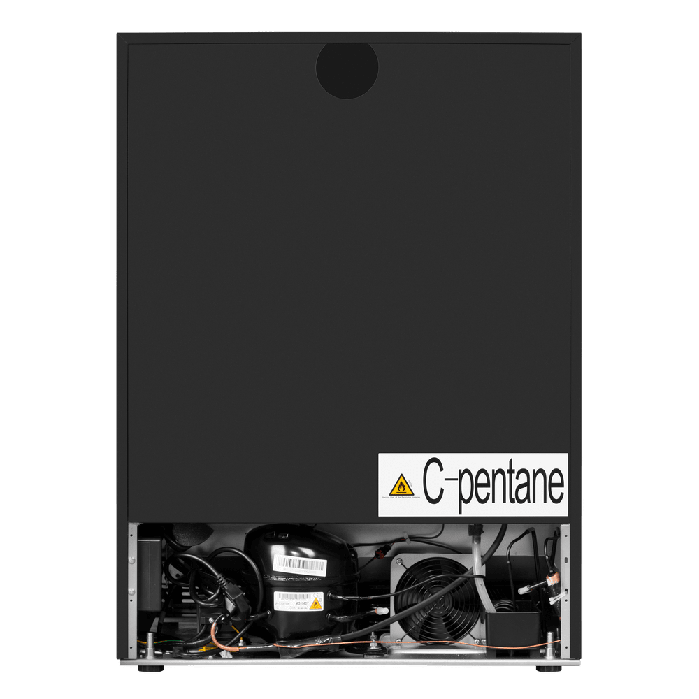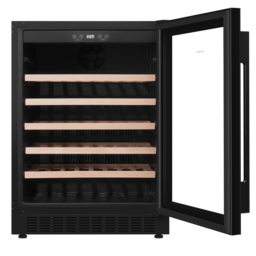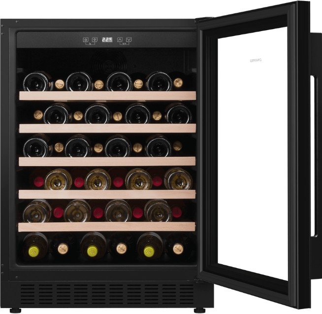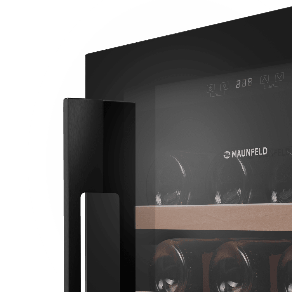 Стеклянная дверь — дополнительный изящный штрих к общему дизайну модели. Специальное покрытие защищает вино от влияния ультрафиолетовых лучей, которые проникают, если шкаф находится в солнечной комнате. Цвет корпуса — черный.