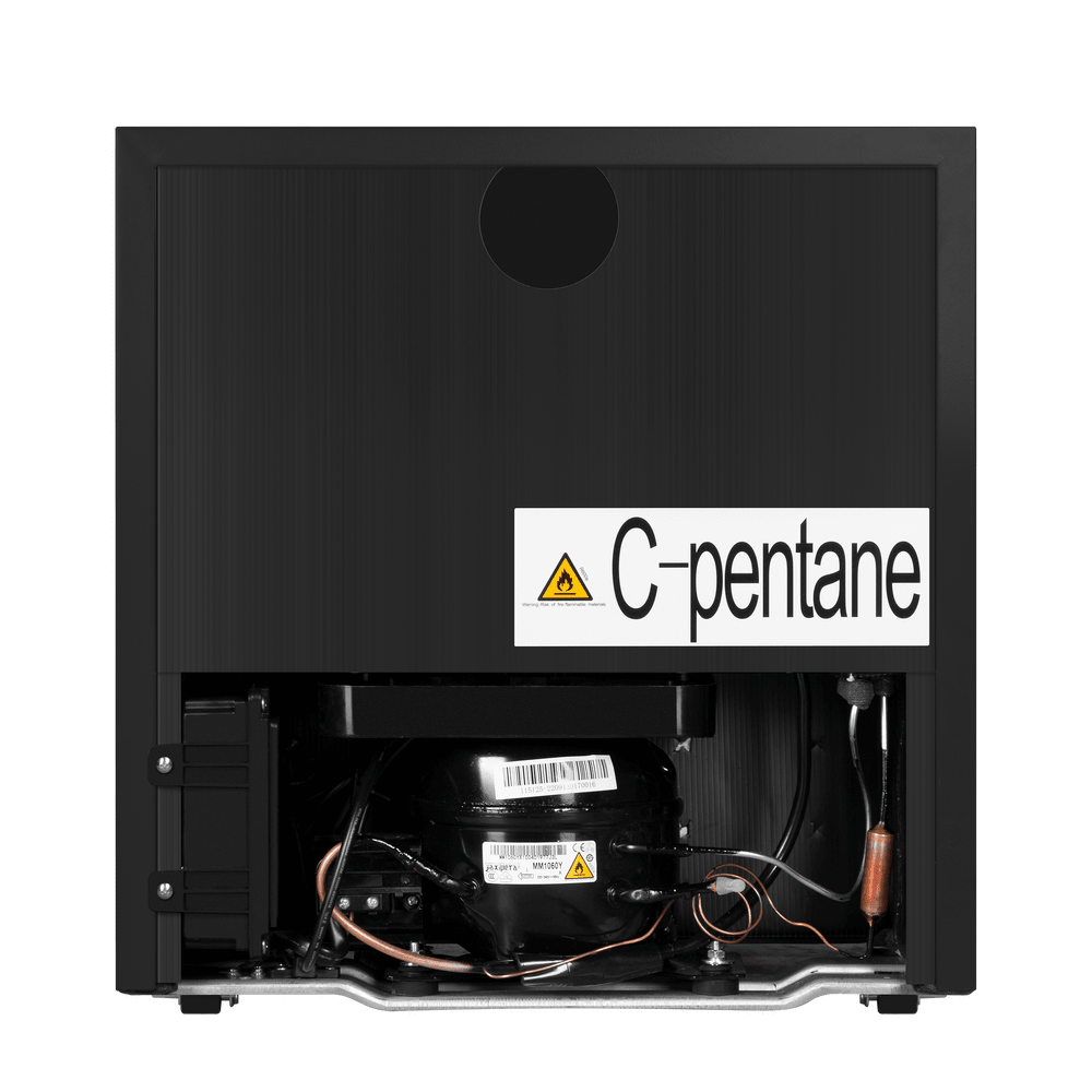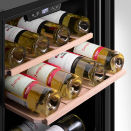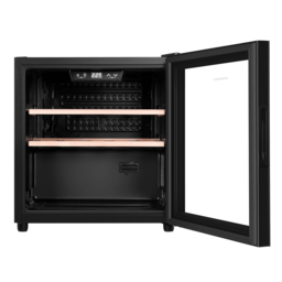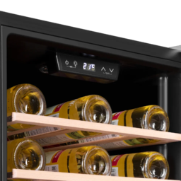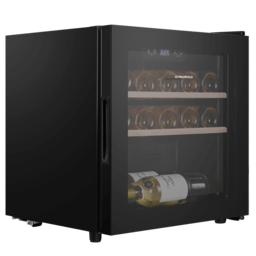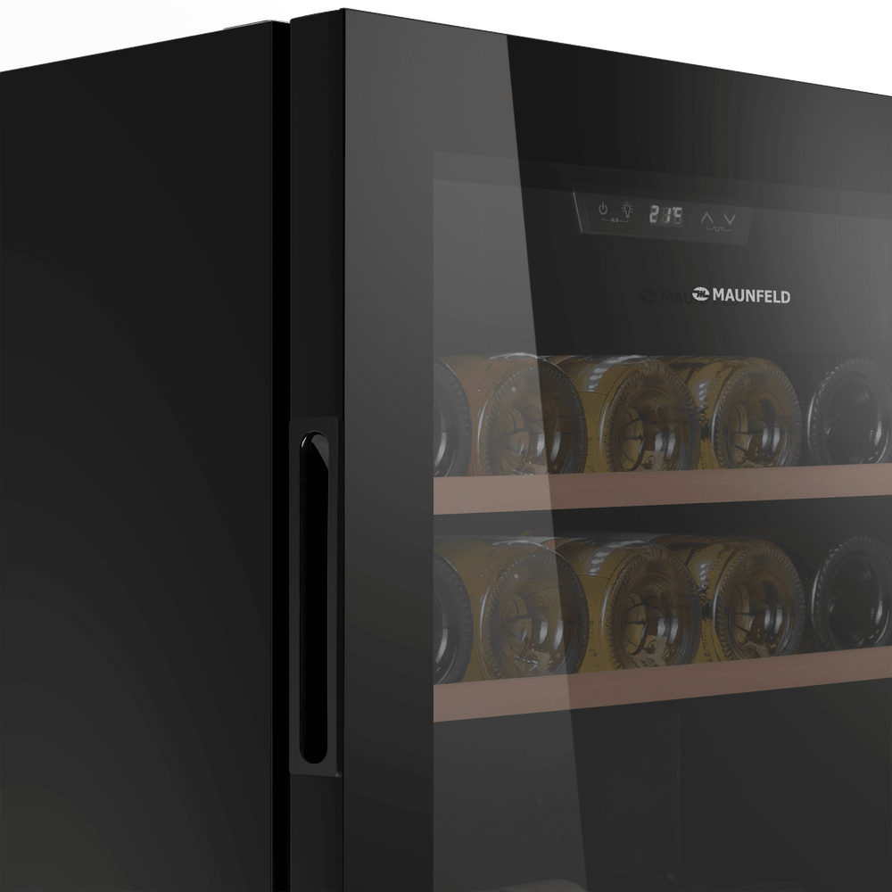 Стеклянная дверь — дополнительный изящный штрих к общему дизайну модели. Специальное покрытие защищает вино от влияния ультрафиолетовых лучей, которые проникают, если шкаф находится в солнечной комнате. Цвет корпуса — черный.