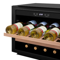 Стеклянная дверь — дополнительный изящный штрих к общему дизайну модели. Специальное покрытие защищает вино от влияния ультрафиолетовых лучей, которые проникают, если шкаф находится в солнечной комнате. Цвет корпуса — черный.